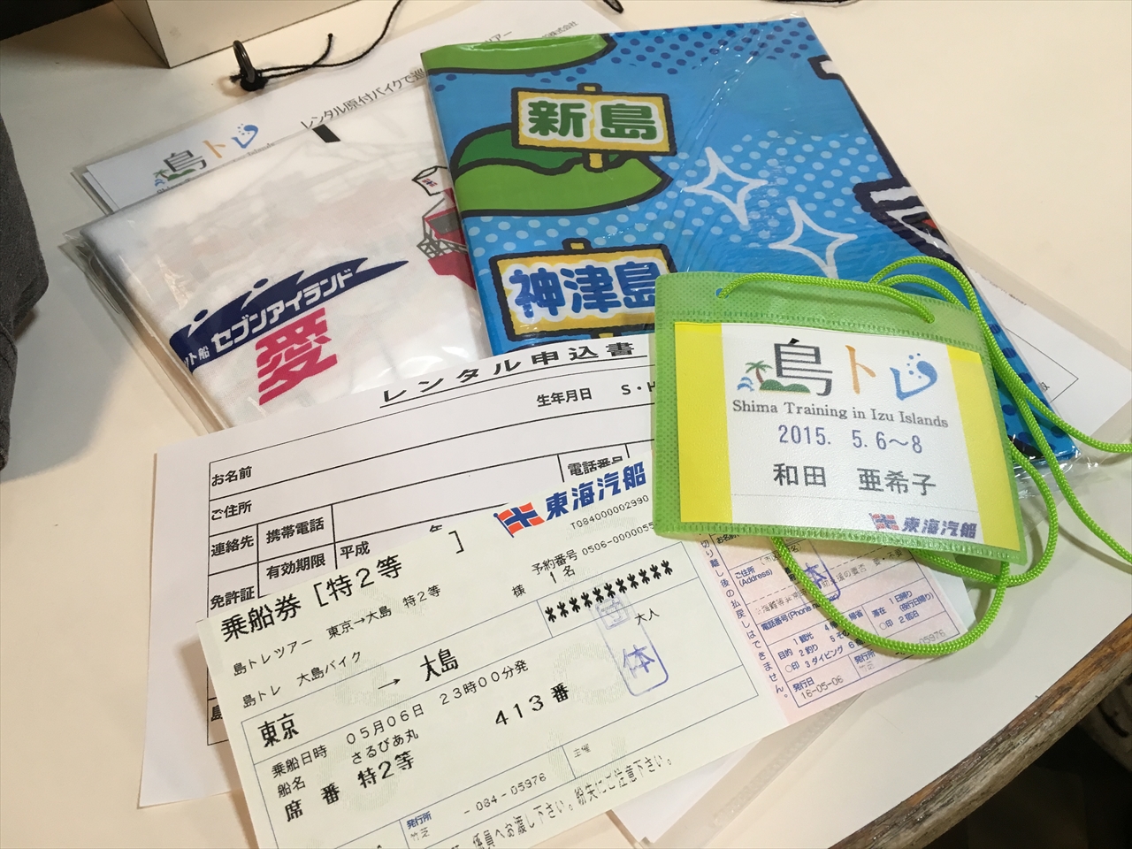 記念品は伊豆七島のレジャーマットに、東海汽船のカラフルな船がプリントされた手ぬぐい。どちらも絵がかわいく、島好きにはうれしい。