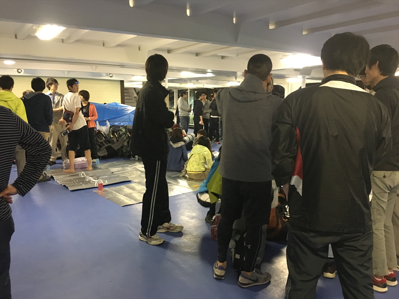 さっそくウレタンマットを敷いて集合しているのは、どうも大学か何かの自転車乗りの学生さんたちのよう。しかもすごい人数だった。