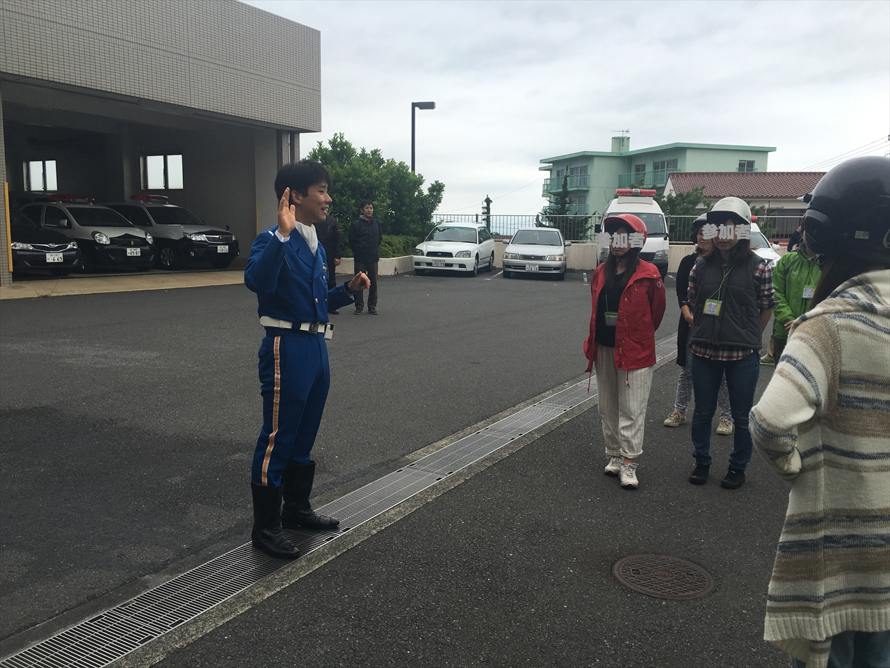 レンタルバイク屋の近くに大島警察署があり、全員でバイクを押してそこまで移動。緩い上り坂になっていたので、実は2日間でもっとも体力使ったのがここだった。