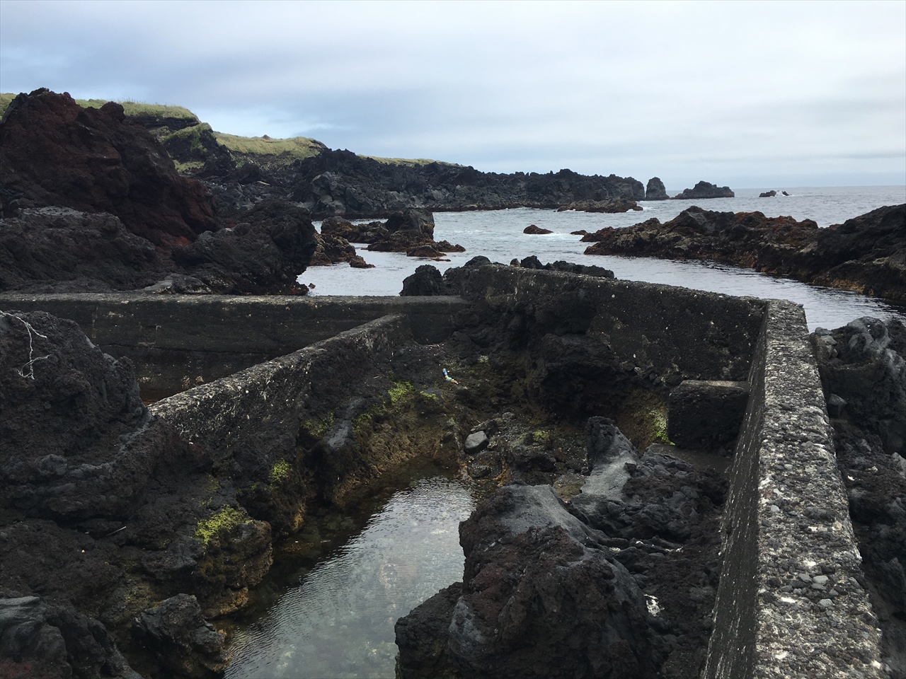 未舗装の坂道を下って、真黒な岩がごろごろ転がる海岸へ。これもきっと火山の爆発で地中から飛び出してきた噴出物なのだろう。