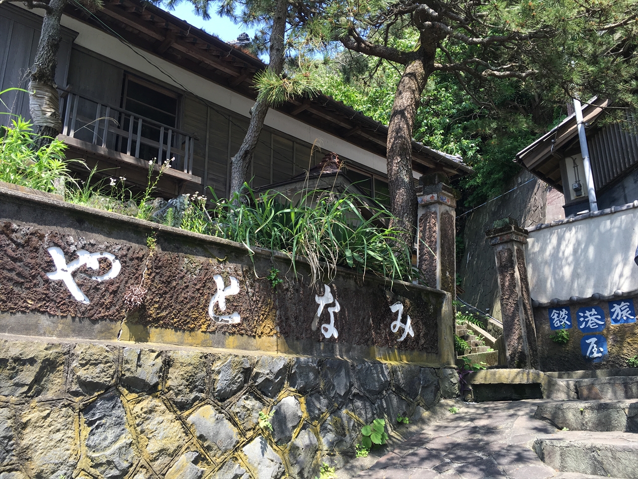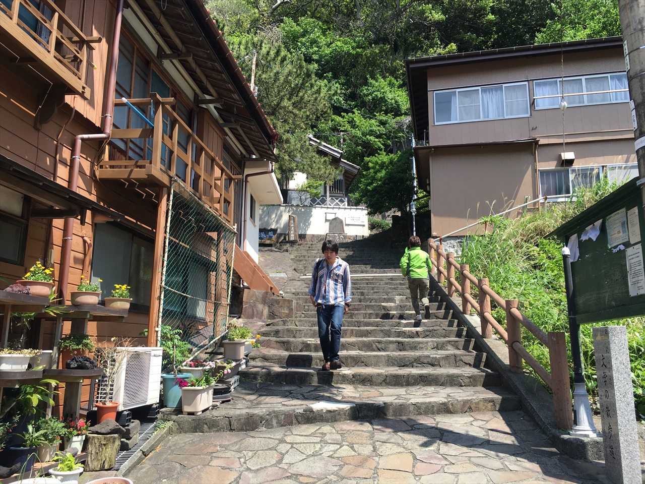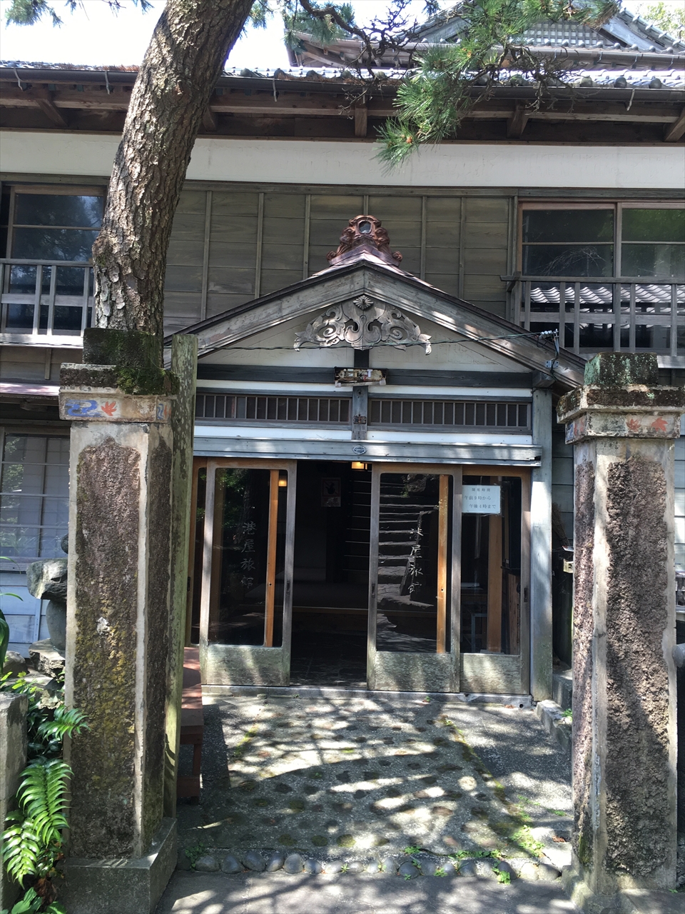 路地から高台に向かう石造りの階段入口には「文学の散歩道」という石碑があった。少し上がっていくと、突き当りの左手に旧港屋旅館がある。