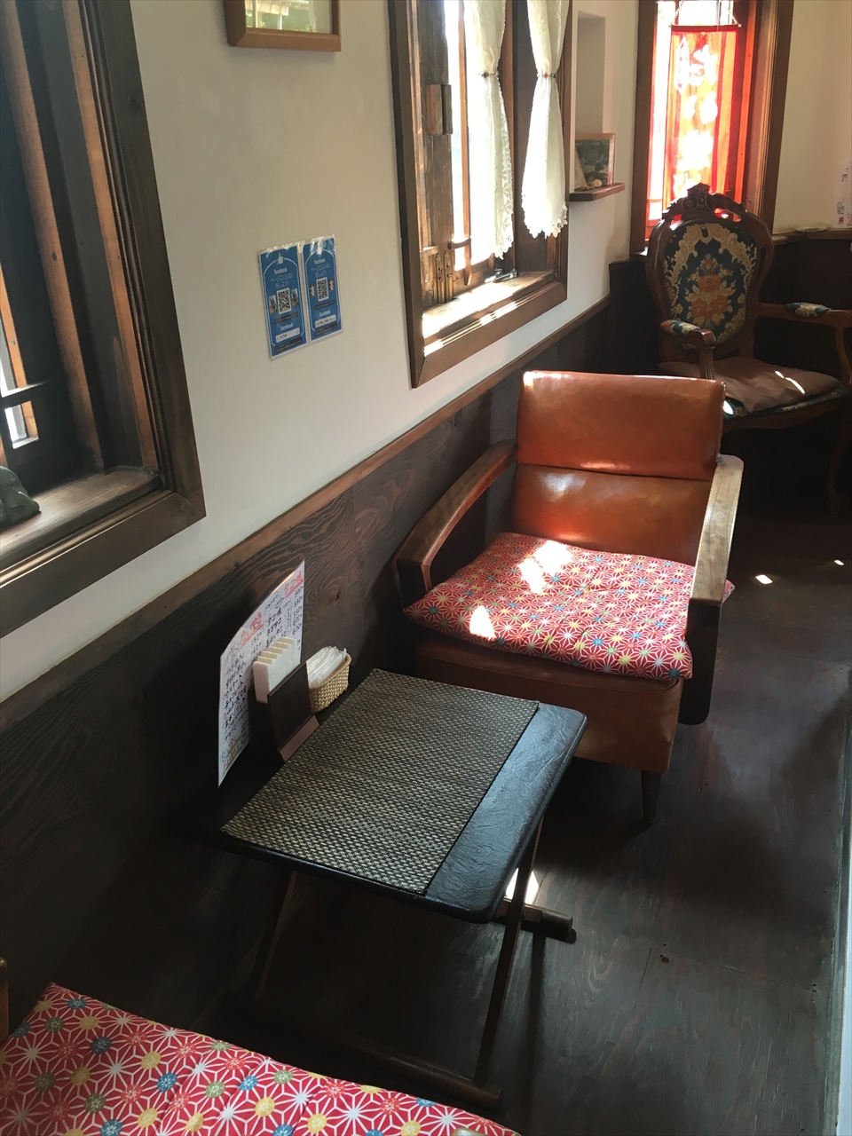 窓際には椅子とテーブルも置かれており、中で座って食べることも。窓の外にはなまこ壁。ひとりで来ていたらきっと、ここで島旅ならではのまったりした時間を過ごしていただろう。