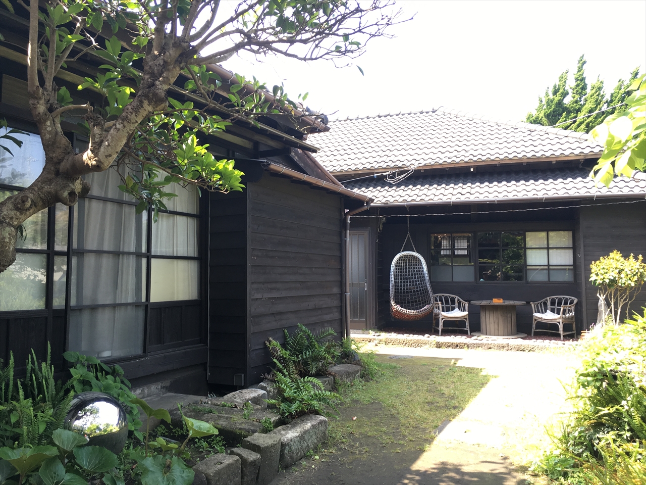 軒下に吊るされたハンギングチェアがゆらりゆらり。