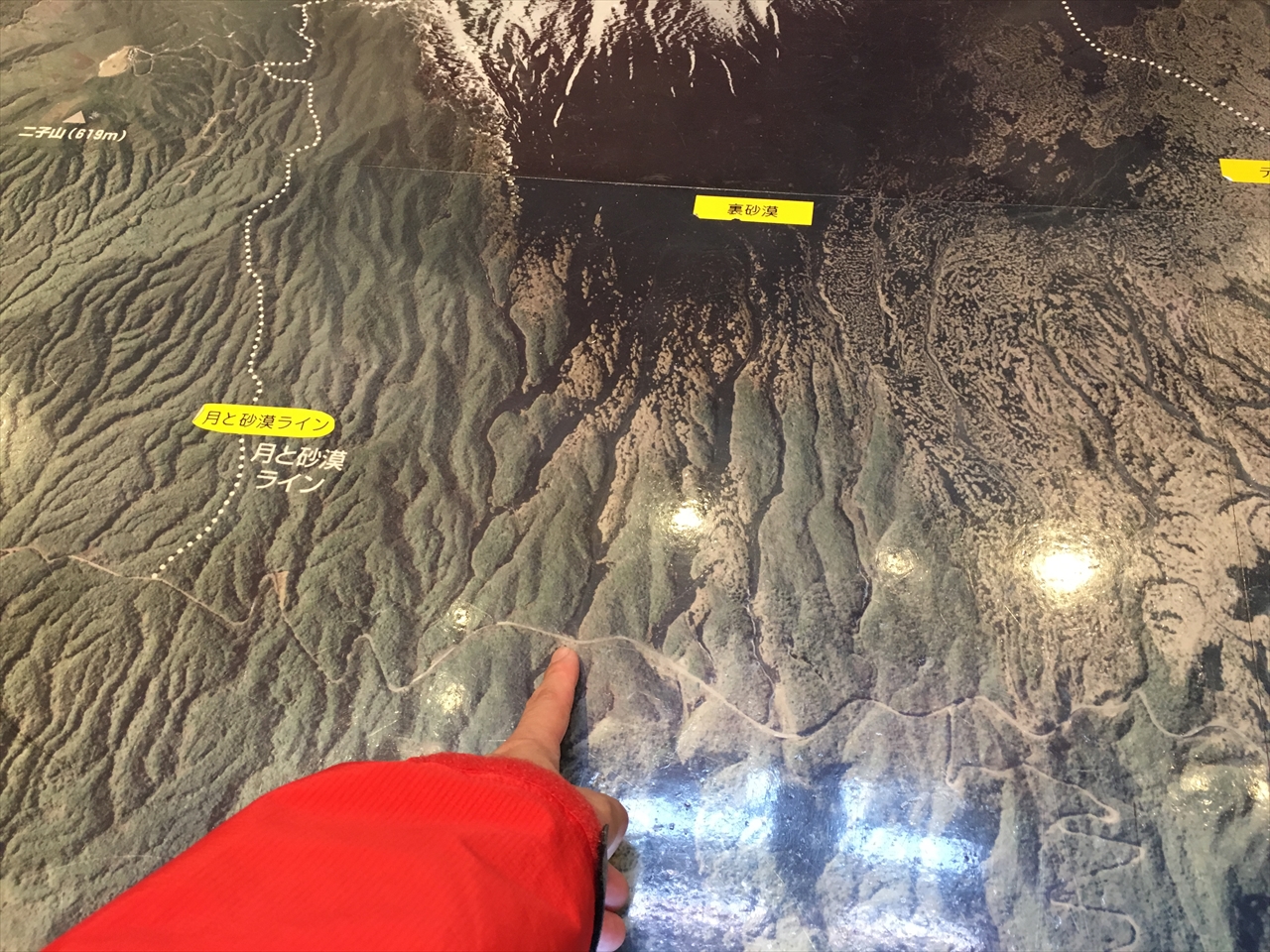 そうそう、ここで床にプリントされた巨大衛星写真地図を見ながら、お巡りさんに走ったばかりの裏砂漠への道を教えてもらった。今回自分たちが走ったのは、「月と砂漠ライン」より北側にあるこの道(指さしているところ)。
