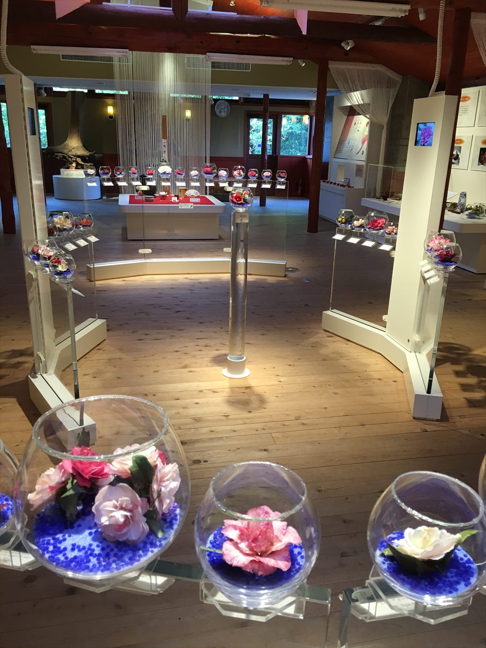 丸いガラス水槽に入った椿の花は、あまりに色鮮やかなのでてっきりプリザーブドフラワーかと思ったら大きな勘違い。