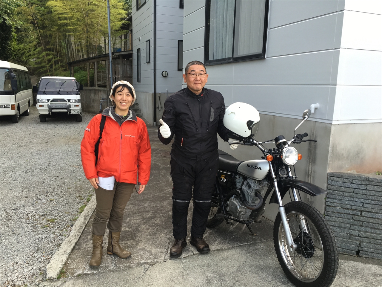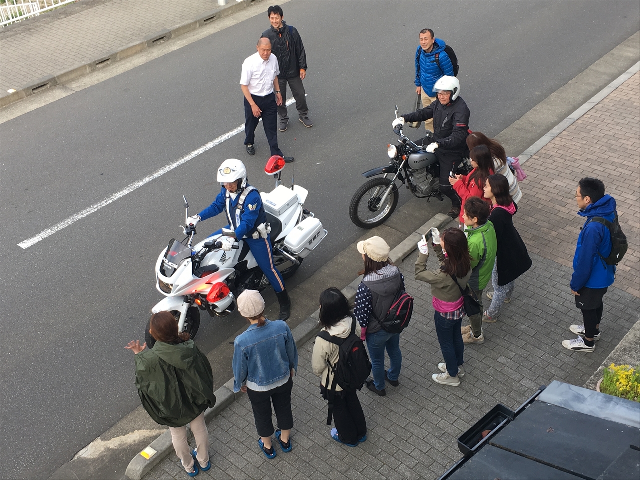 経験者組が宿についてしばらくした後、ゆっくり安全運転で走ってきた初心者組も到着し、一日お世話になった大島警察署のふたりに別れを告げた。