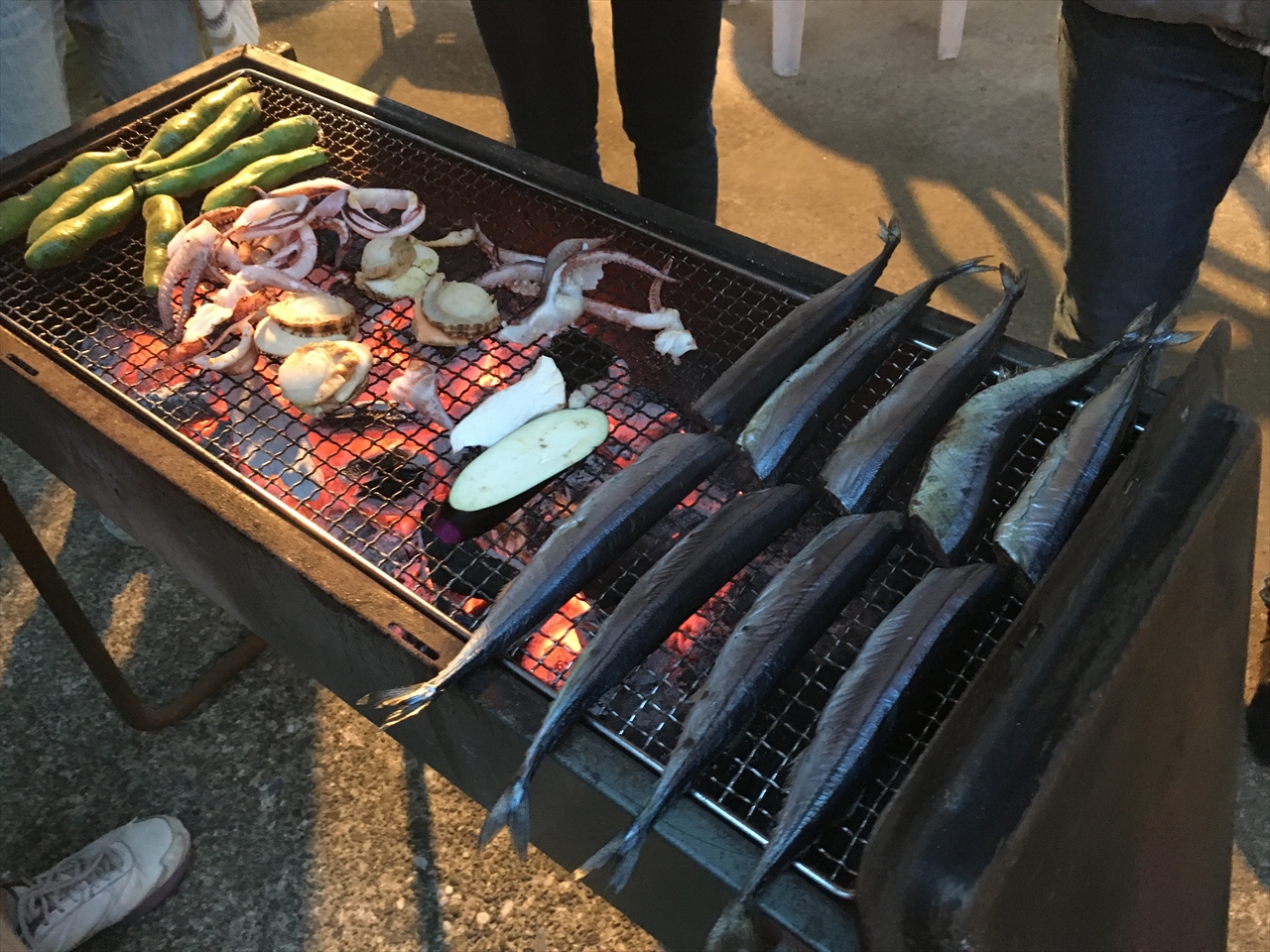 途中で宿のご主人が、サンマの一夜干しを持ってきてくれた。島のサンマはちょっと小ぶりで、それを一夜干しにするんだと。開いていないサンマの一夜干しなんて初めて見たかも。