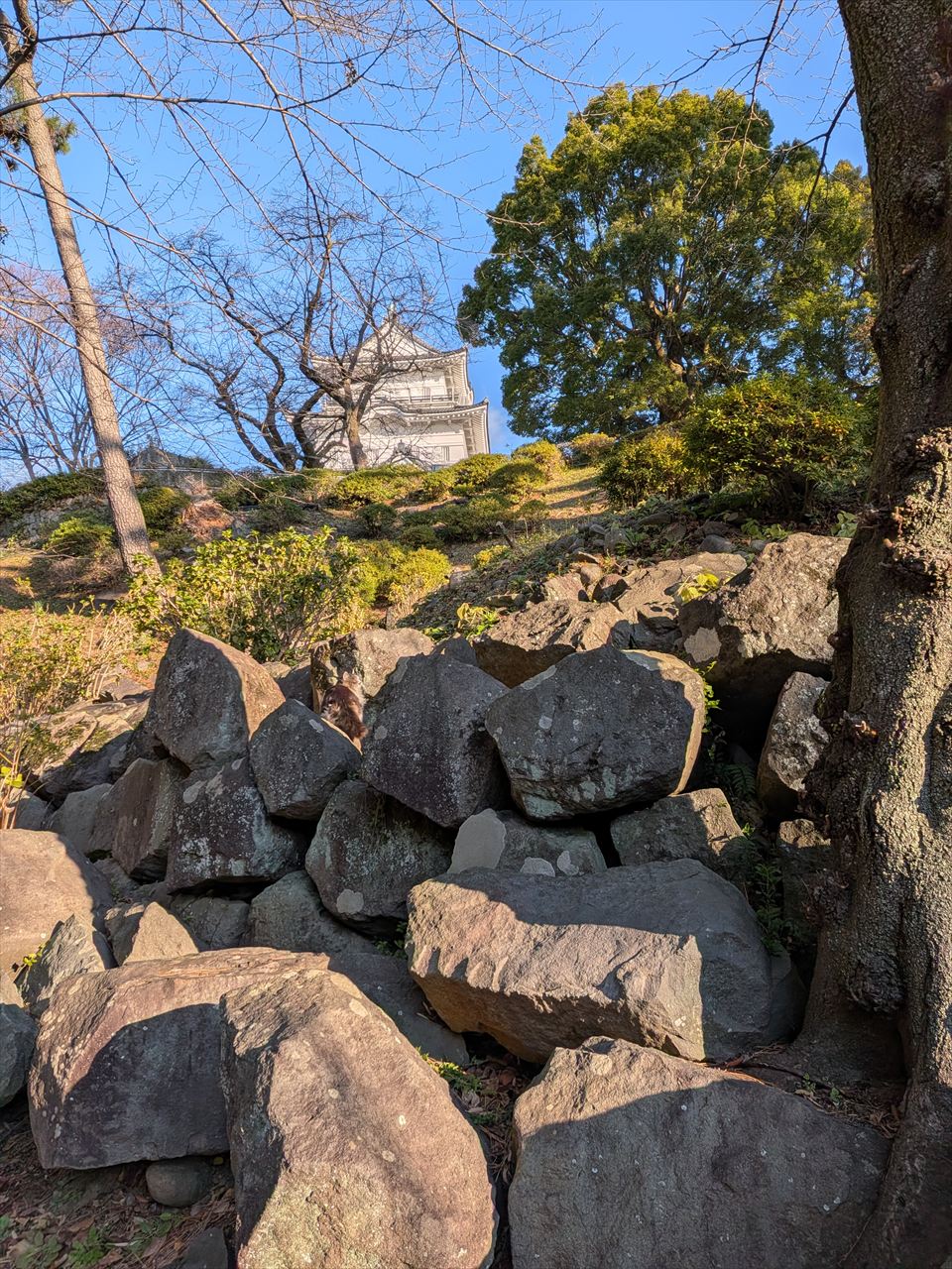 今まで表側からしか見たことありませんでしたが、裏の神社があるほうにまわると、石垣が地震で崩れた跡も残っています。なかなか迫力あって面白い場所です。