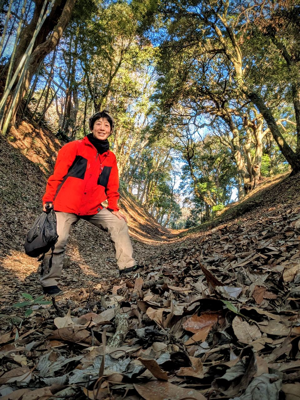 この「小峯御鐘ノ台大堀切東堀」もそんな堀の中のひとつ。住宅街から少し入ったところにあるのですが、足を踏み入れると、そこはまるで別世界。ちょっと平衡感覚が狂うような視覚体験ができます。通常、お城の堀というと、直角に切り立った石垣や、整然とした水堀をイメージしますが、ここは「空堀(からぼり)」といって水がなく、左右が緩やかな、そしてな圧迫感を感じるような斜面になっていて、その底が道となっています。