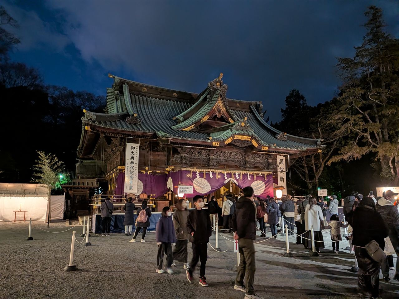 夜でも多くの参拝客で賑わっていて、参道に並ぶ屋台の明かりが幻想的でした。
