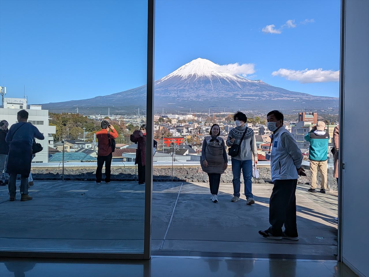 最上階には展望ホールがあります。 ここがまさに絶景! 目の前に本物の富士山がドーンとそびえ立ち、遮るもののないパノラマを楽しめます。ボランティアガイドの方もいて、一人旅の私にも親切に声をかけてくれ、シャッターを押してくれました。