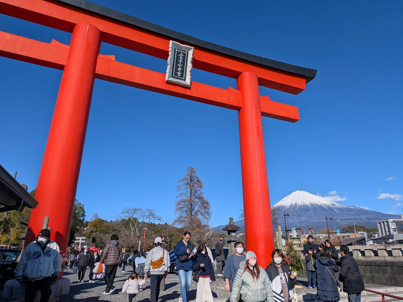全国に1,300社以上ある浅間神社の総本宮です。 やはり三が日ということですごい人出!参道には屋台がずらりと並び、熊手や破魔矢といった縁起物を売るコーナーも大盛況。三嶋大社もそうでしたが、この地域の神社の初詣熱はすごい。