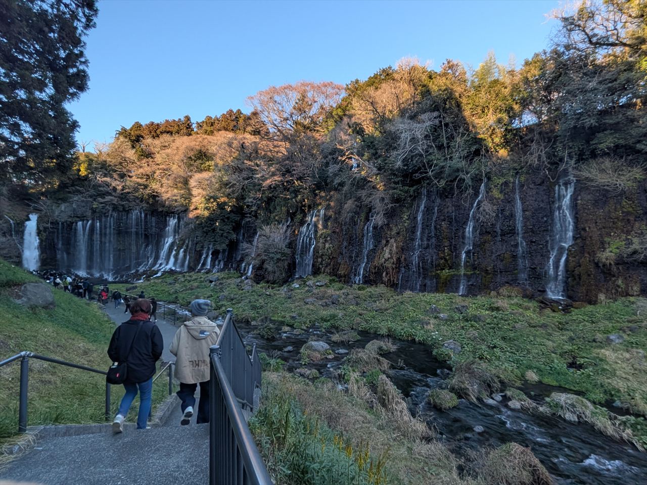 富士山の「新富士火山層」(水を通す層)と「古富士火山層」(水を通さない層)の境目がこの崖になっていて、その間から地下水が湧き出しているため、雨が降っていなくても常に美しい水が流れ続けています。 晴れた日の午前中には、滝にかかる虹が見られることでも有名です。