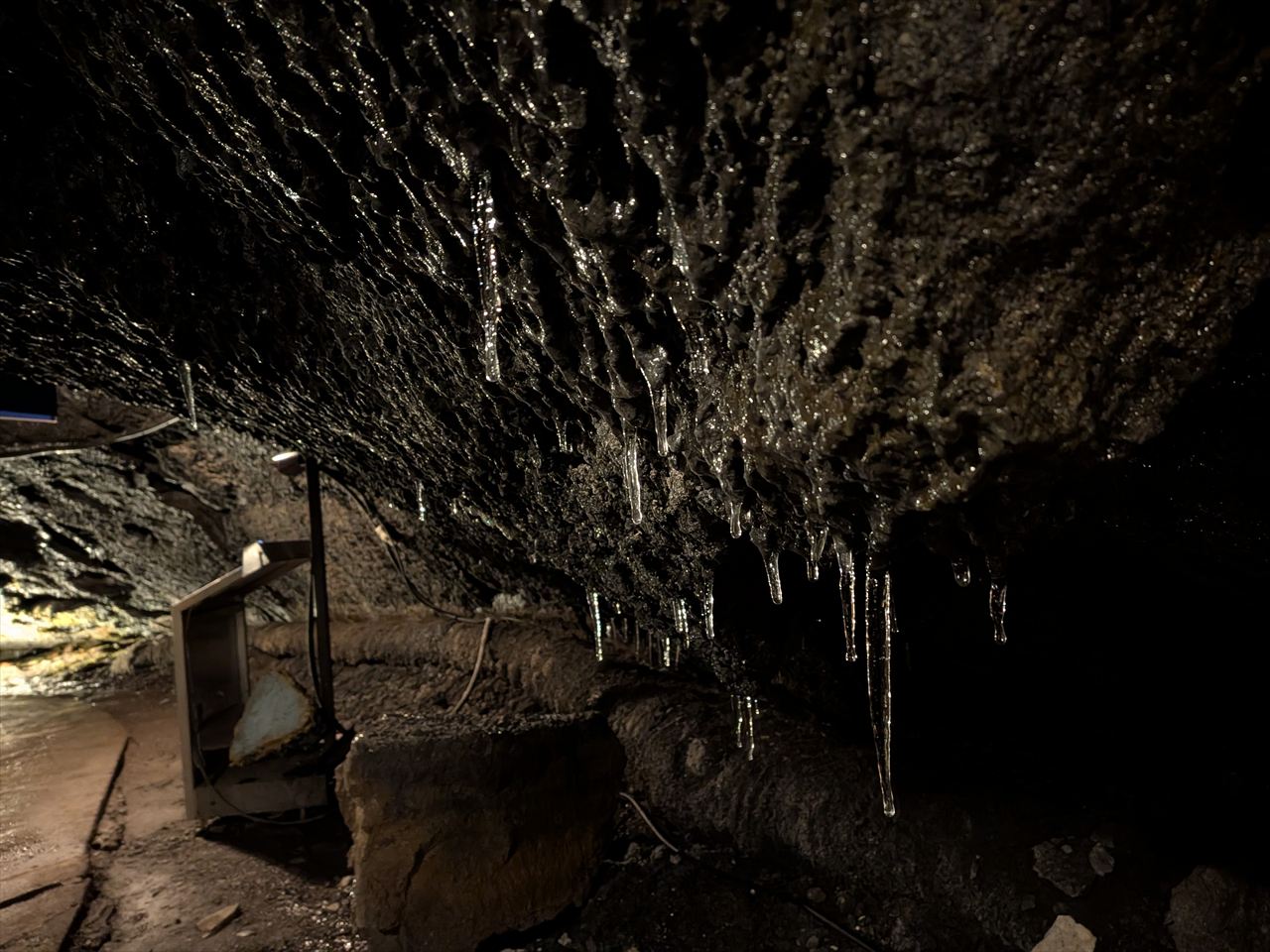 「富岳風穴」、以前夏に来た時は「外は30度越え、中は0度」という温度差で、「まさに天然のオアシス!」と感動したのですが、冬に来ると「外も寒い、中も寒い」であまり変わりません(笑)。 それでも、天井から下がる小さなツララが成長している様子は神秘的でした。
