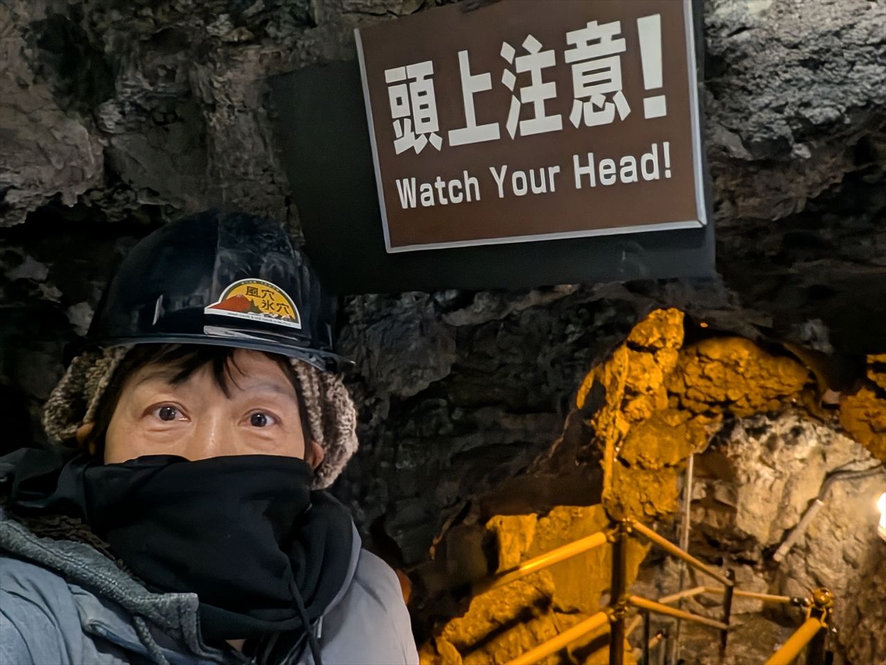 こちらは竪穴型の「鳴沢氷穴」。途中、つるつるの坂道をしゃがみながら下る箇所もあり、手すりにしがみつかないと滑ります。ここは初めて来ましたが、なかなかの冒険スポットです。「閉所恐怖症」の方は絶対に入っちゃだめな場所です。
