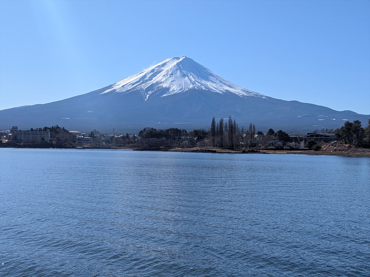 空気が澄んでいて、視界がクリア。空の青さが深く、雲ひとつない快晴。山頂から麓まで、雪化粧した姿がくっきりと見える。