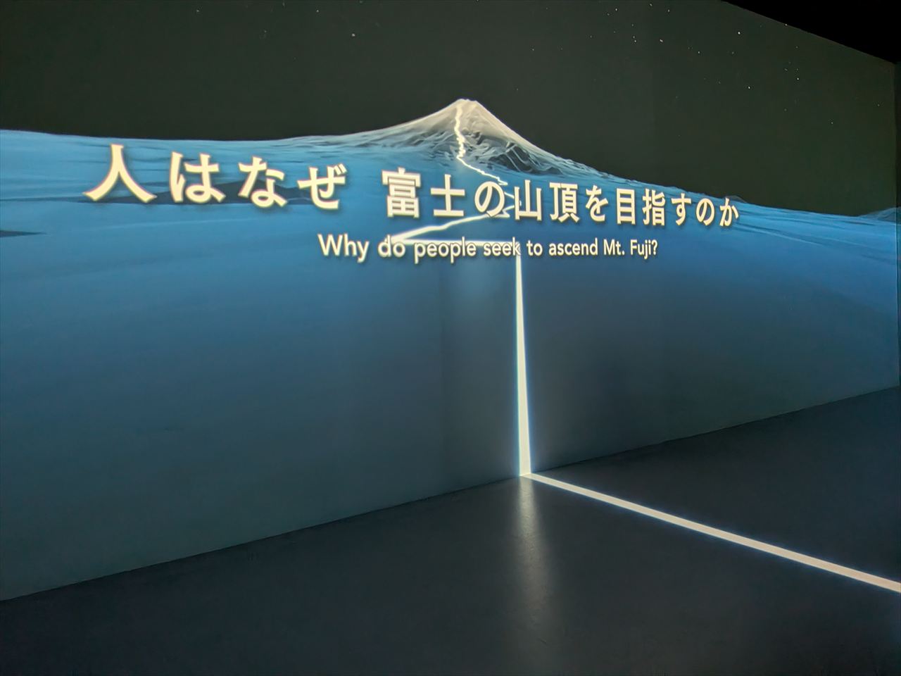 そして、ここの目玉は「ふじさんVRシアター」です。 8分程の映像なのですが、これがすごい! 360度、四方の壁だけでなく床にまで映像が投影され、麓から山頂までの富士登山を擬似体験できるんです。最初は緑豊かな林道から始まり、次第に木々がなくなり、ゴツゴツとした岩場へ。 厳しい環境の中で懸命に登る登山者たちの姿。そして山頂へ到達し、眼下に広がる雲海や満天の星空。 映像美と没入感が素晴らしく、見終わった後にはちょっとした達成感すら感じてしまいました。これも非常におすすめです。
