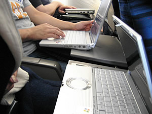 4人ともPCを広げて、隣の団体客が