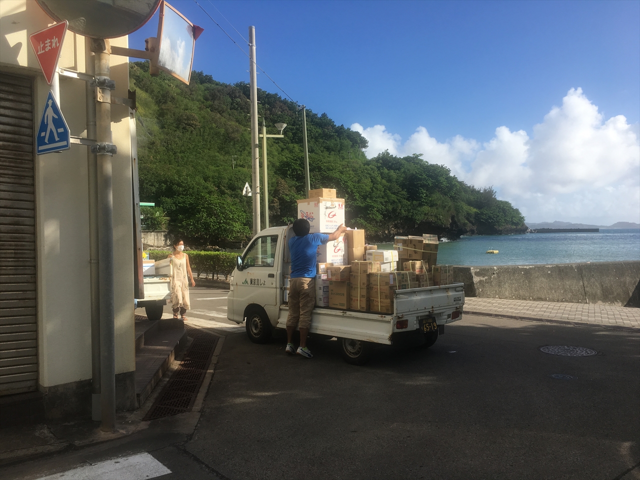 私たちが乗ったははじま丸が到着した後は、父島経由のコンテナで運ばれた食料品や日用品などが6日ぶりに到着した日で、商店はどこも、シャッター降ろして段ボールの運び込みを行っていた。