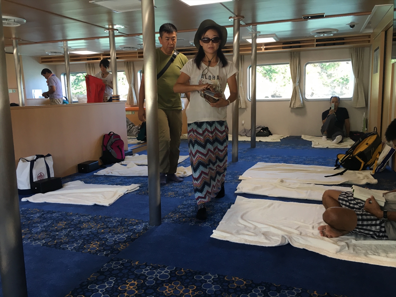 湾内にかなりうねりがあったので、もし沖合にでて揺れるなら横たわったほうが楽というガイドさんのアドバイスで、後方の和室へ行った。
