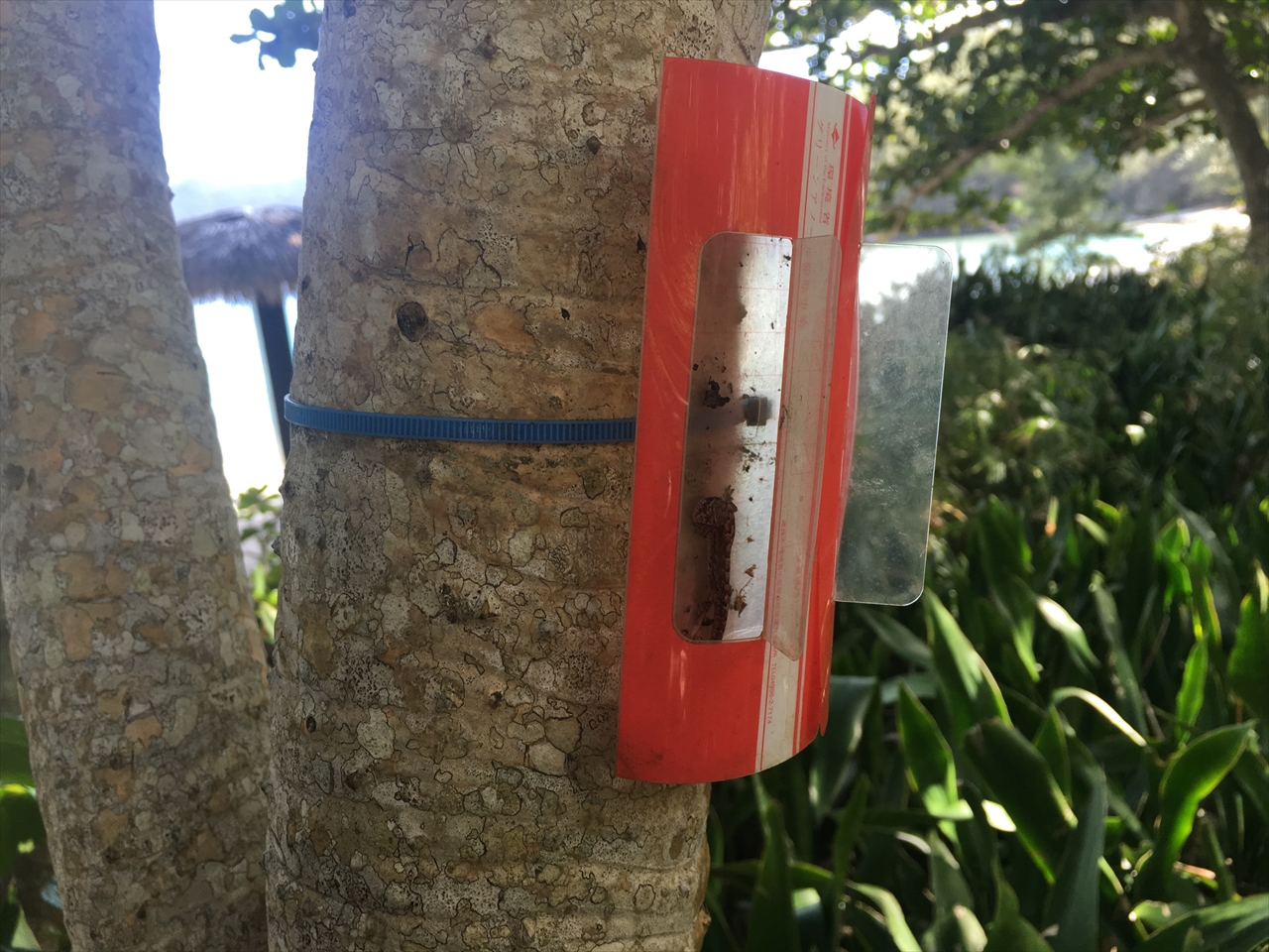 外来種のトカゲ「グリーンアノール」を駆除するための粘着トラップだ。かわいそうに、別の種のトカゲがかかってしまっていたが。