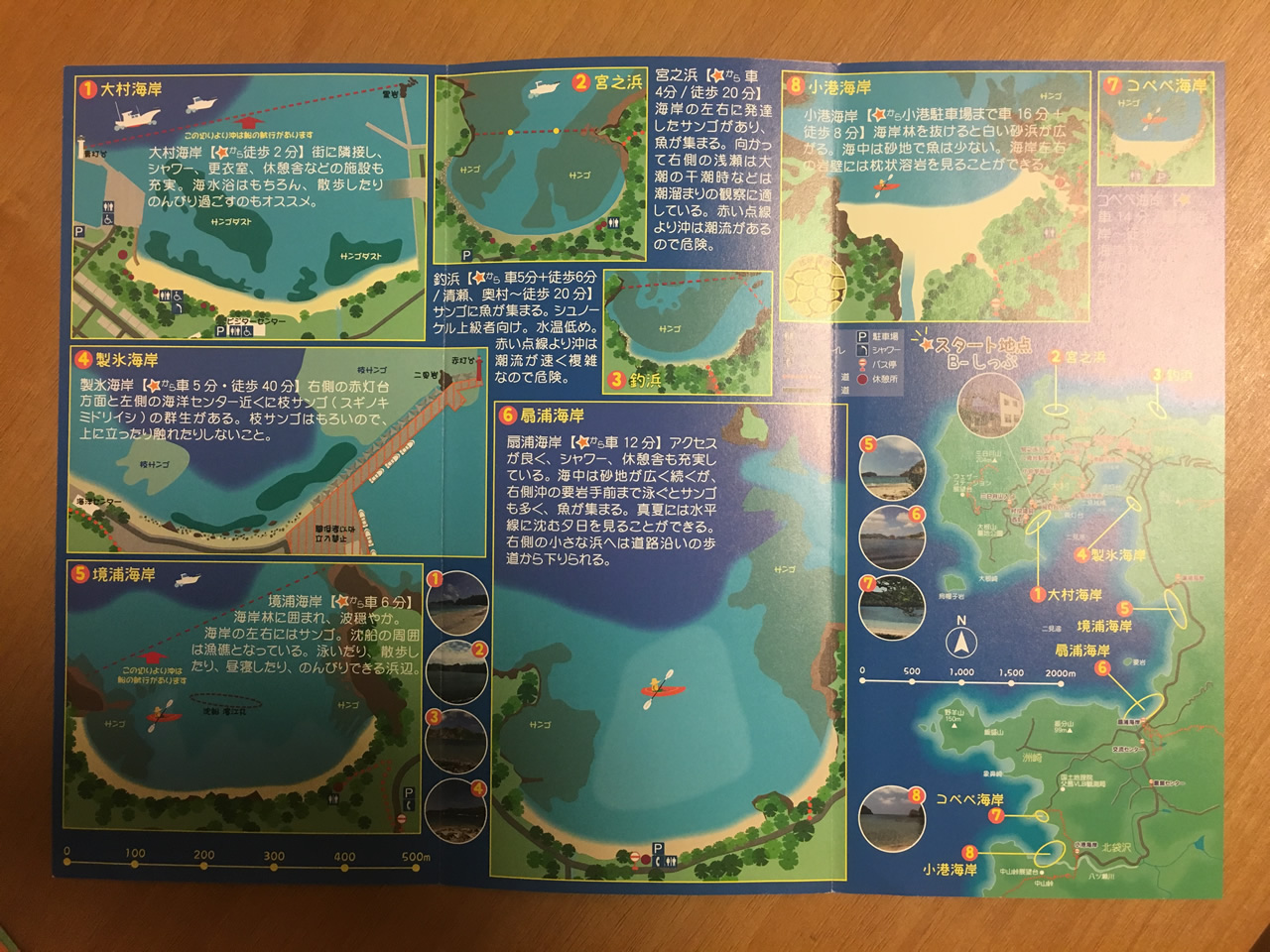 リーフレットには「サンゴ礁が発達し、熱帯魚も多いため、シュノーケリングに最適」とあり、「海辺であそぼう!海散歩まっぷ」を見ても、宮之浜とコぺぺ海岸が、のんびり海水浴にもシュノーケリングにも「◎」となっていた。