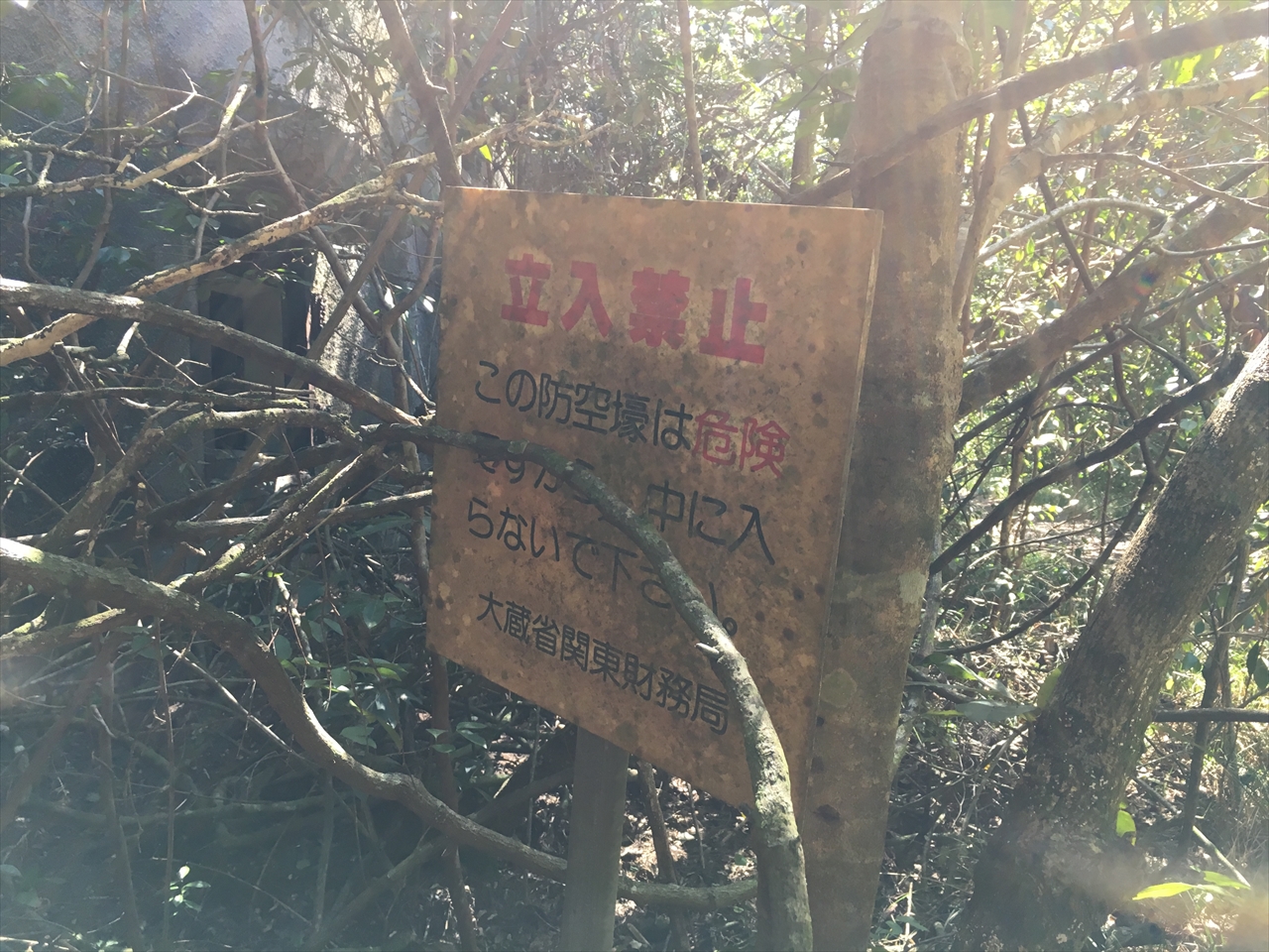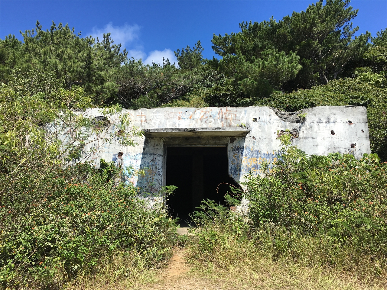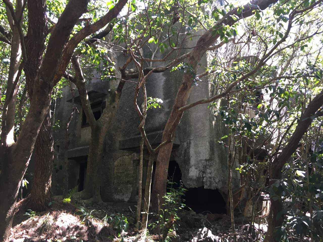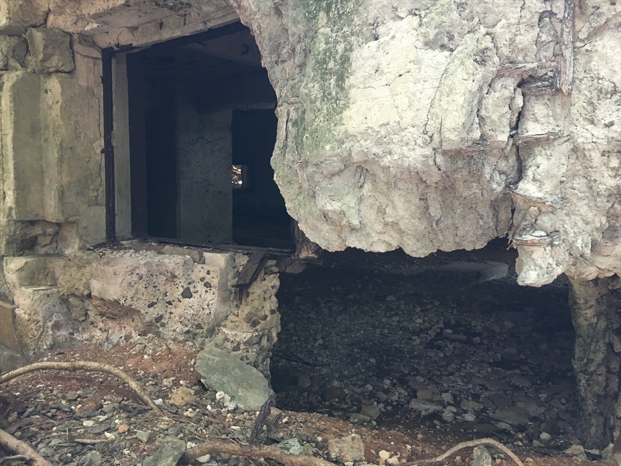駐車場から海沿いの展望台までの未舗装の道沿いには、壊れかけた軍用施設跡がある。
