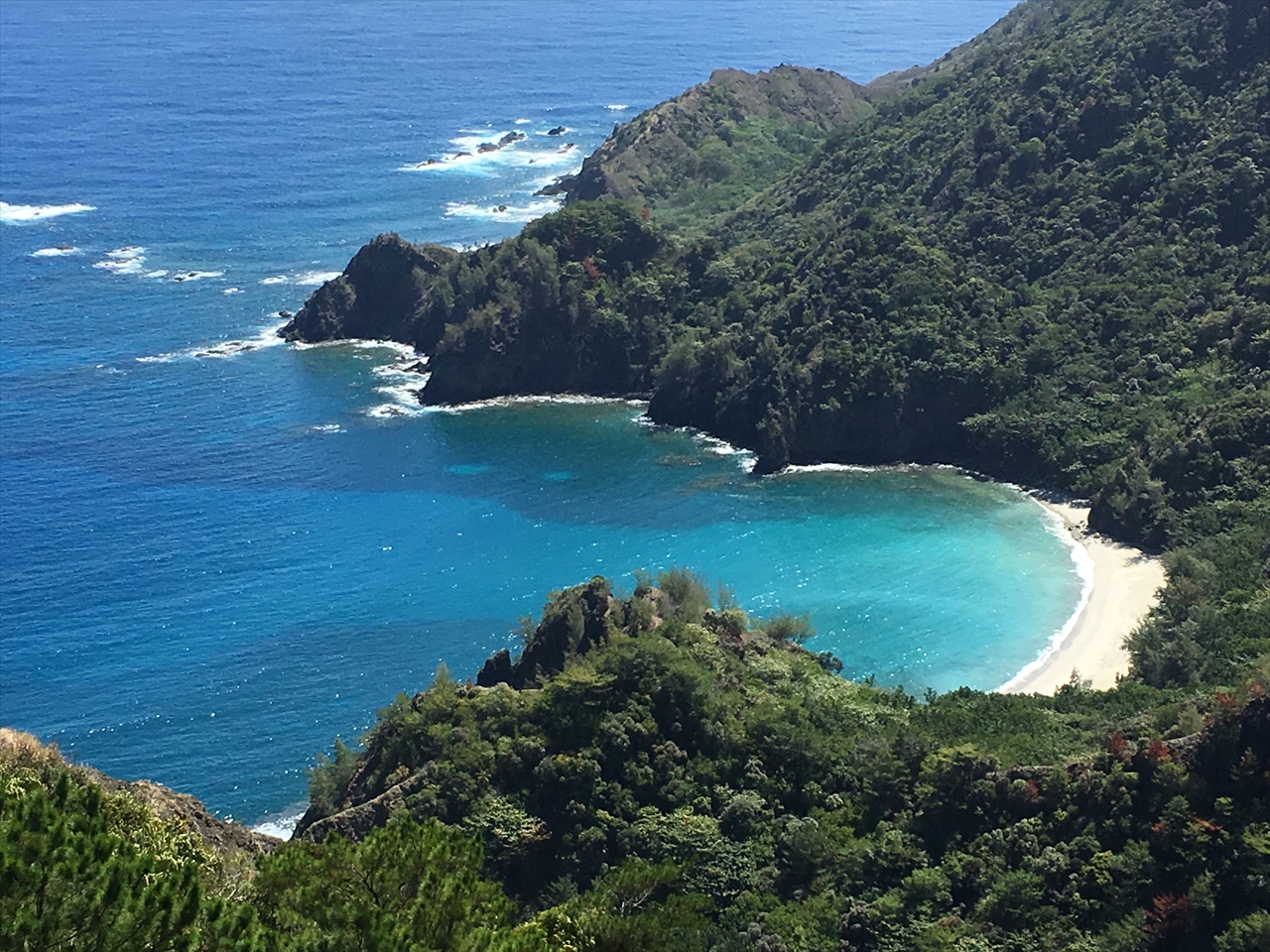 展望台から見下ろす先には、美しい白砂の初寝浦。このビーチに降りていく舗装道路はなく、都道からは急な自然歩道を下っていくしかない。