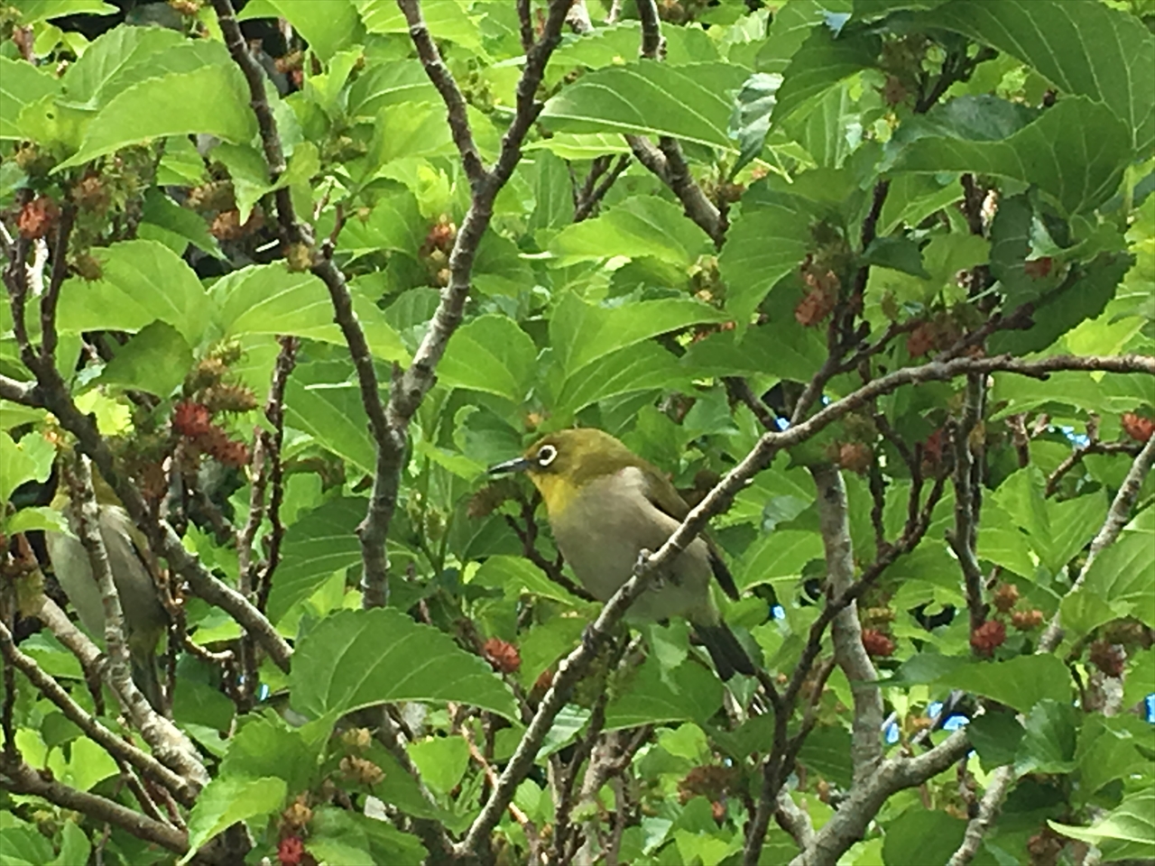 ここで大量のメジロを発見。枝から枝に飛び移り、赤い実を一生懸命ついばんでいた。