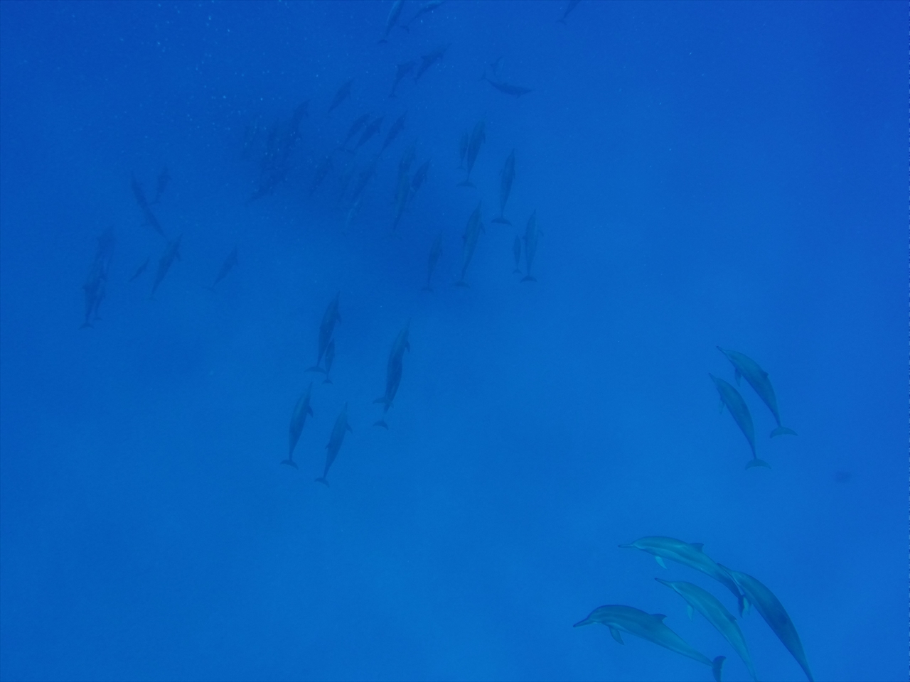 群れの規模も大きく、まっすぐに、時に大きな弧を描いて何十頭ものイルカがディープブルーの海をすいすいと泳いでいく風景は幻想的だ。