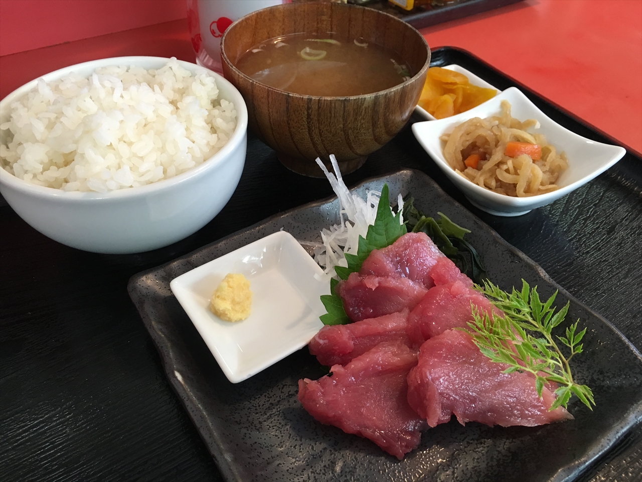 見た目はマグロ赤味のようでもあり、また表面や周囲の千切れたような感じは馬刺しのようでもある。おろし生姜が添えられていた。