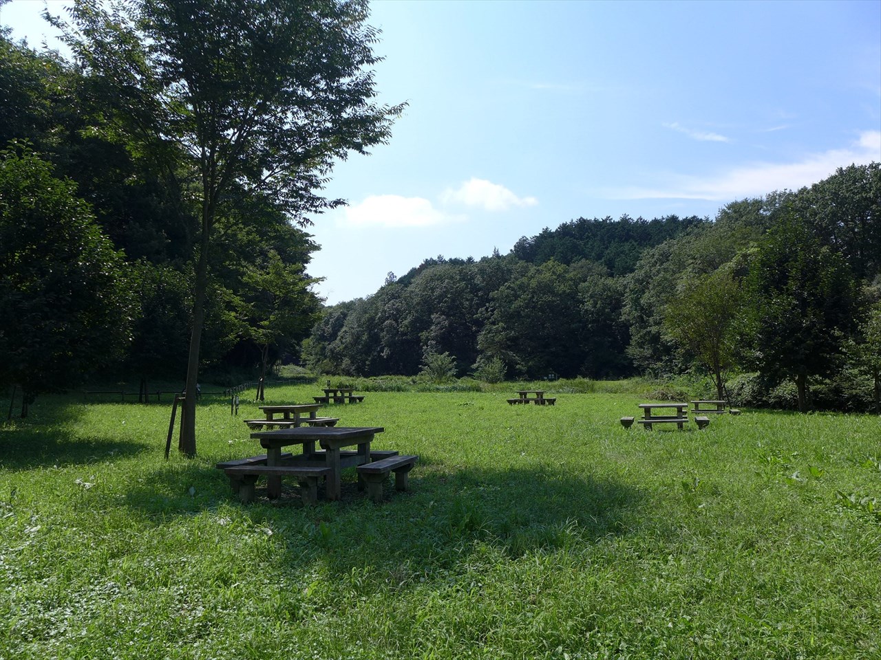 原っぱに木で作られたテーブルとベンチがいくつも。