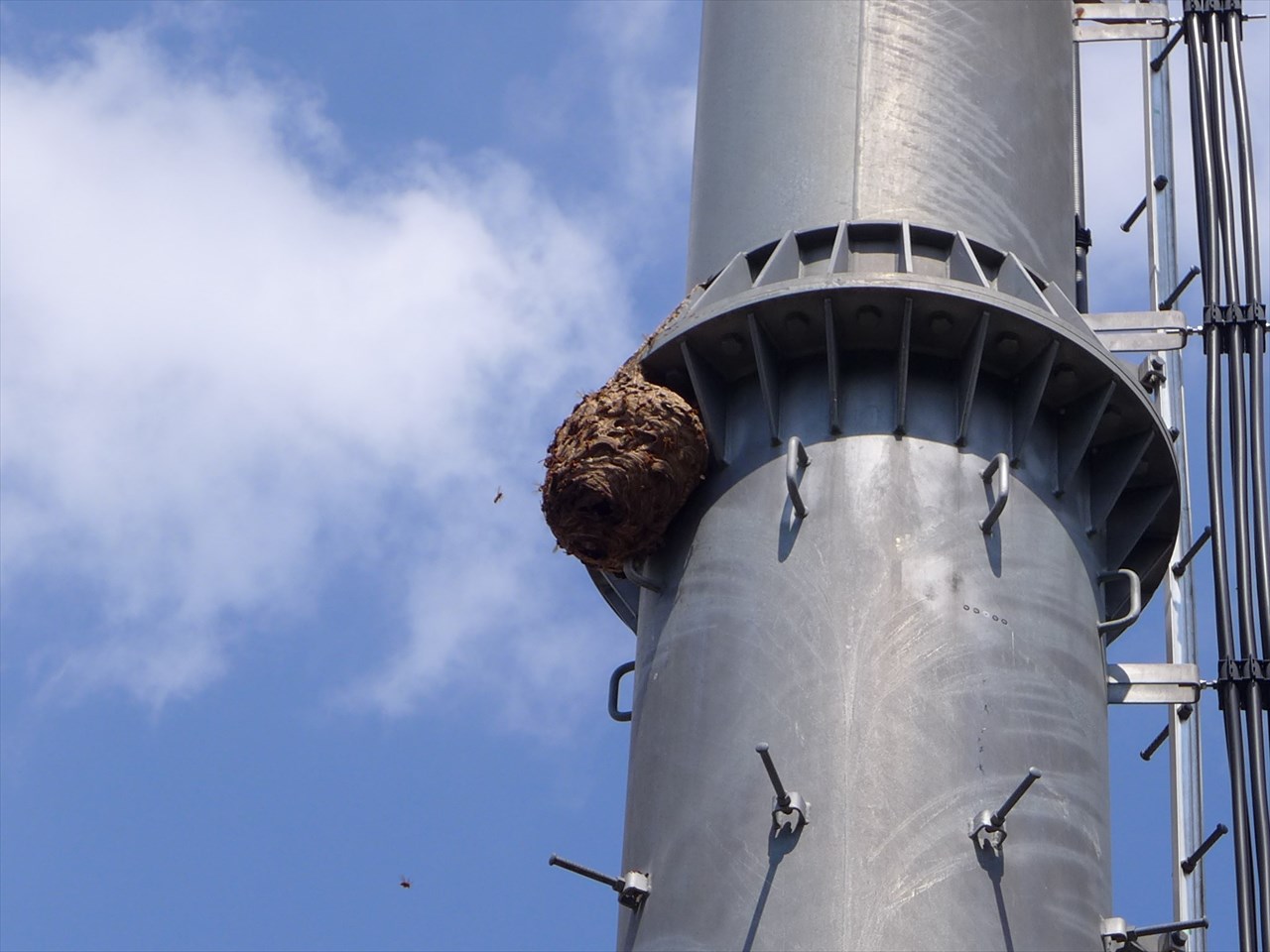 そっかあの看板は、一般論として注意を呼び掛けているのではなく、ここに巣ができてしまったのを受けてのことだったのか。既に町内会から行政やアンテナ管理事業者への連絡は済んでいるのだと思うが、あの高さの場所となるとネットかぶせるのも一苦労だ。