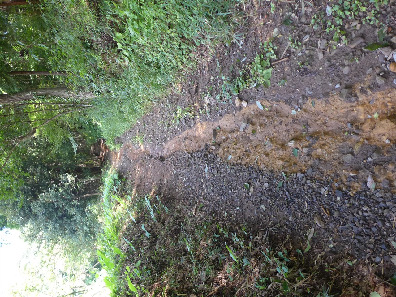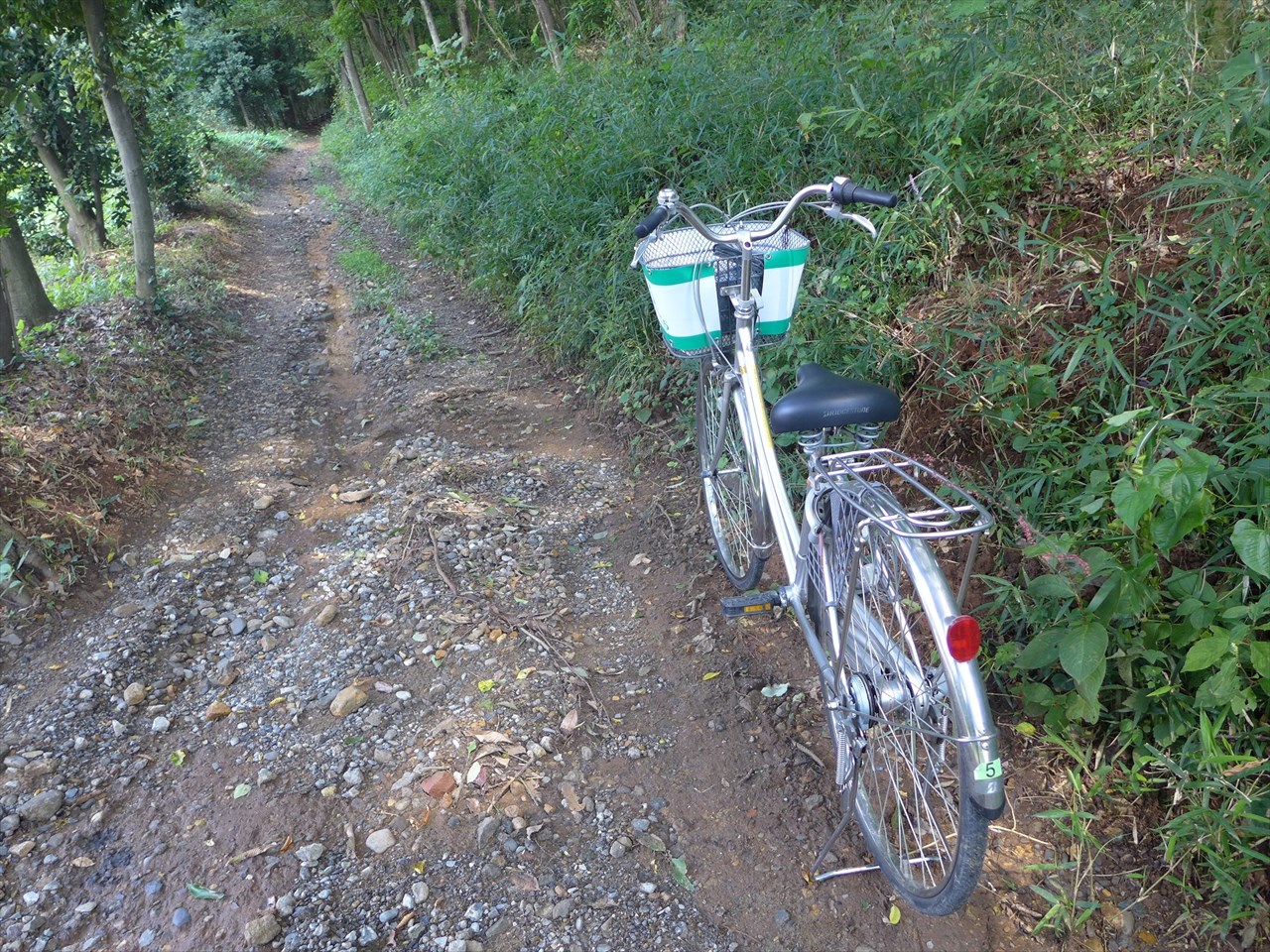 2日前の台風の際の大雨の跡だろう、道の中央が水で筋状にえぐられ茶色い土が見えていた。自転車でも行けるとあったが、足を滑らせてもいけないので置いていくことに。