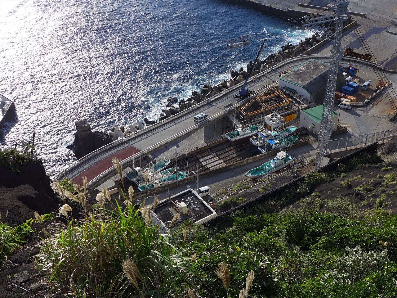 青ヶ島ふれあいサウナからの帰り、出張で八丈島から来ている人の車に乗せてもらった。その際、集落とは反対側なんだけど、島で現在唯一稼働している三宝港に立ち寄った。