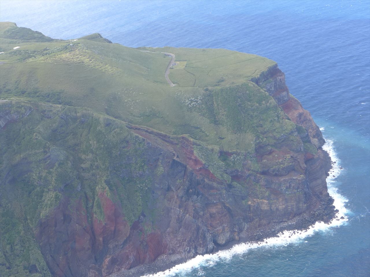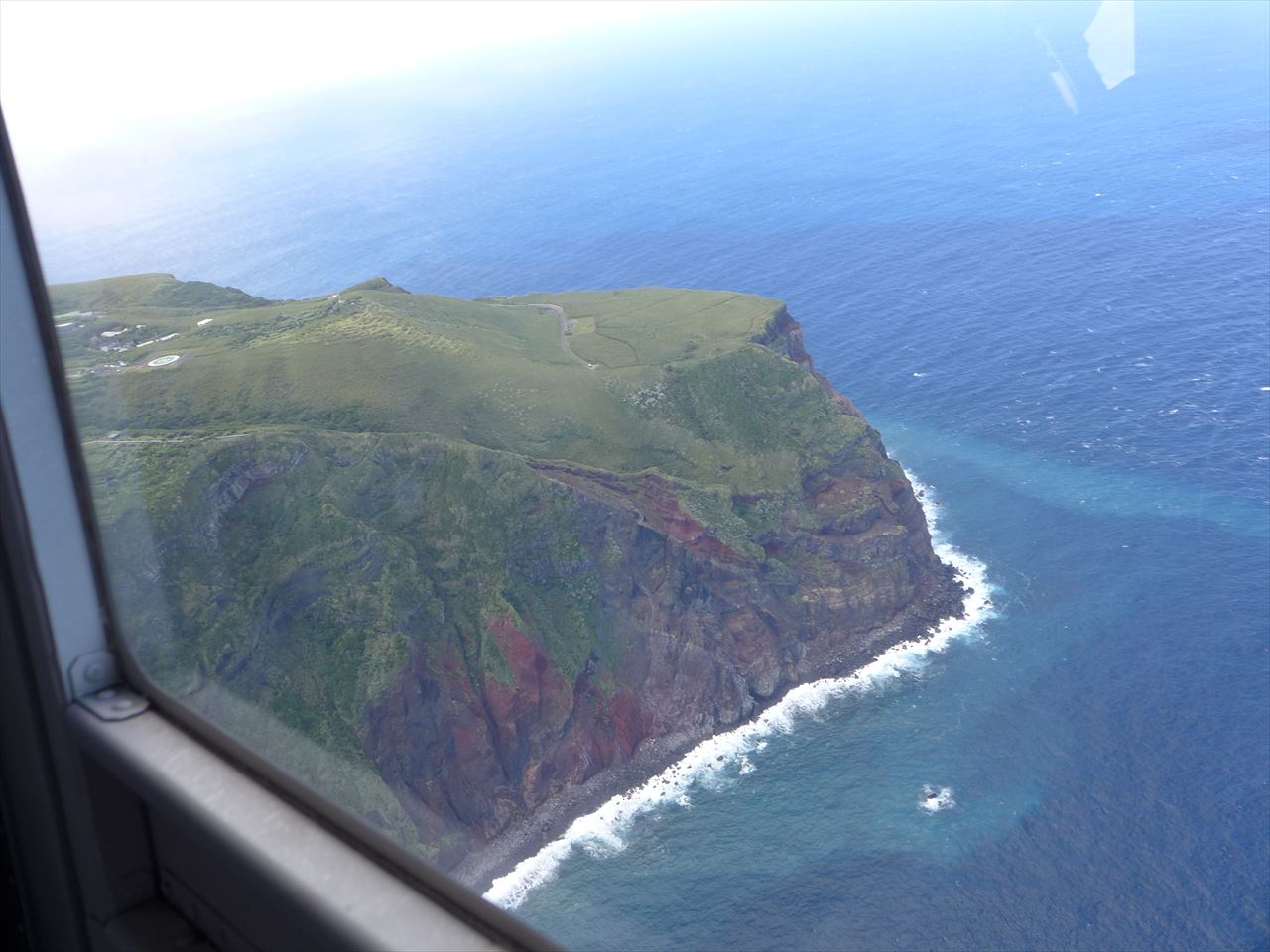あっという間に青ヶ島を飛び立ち、振り返ると赤茶色の岩肌にウグイス色のコーティングをかけたかのような青ヶ島の姿が見えた。