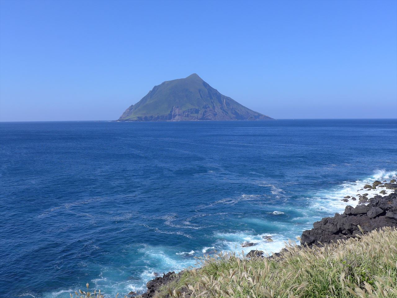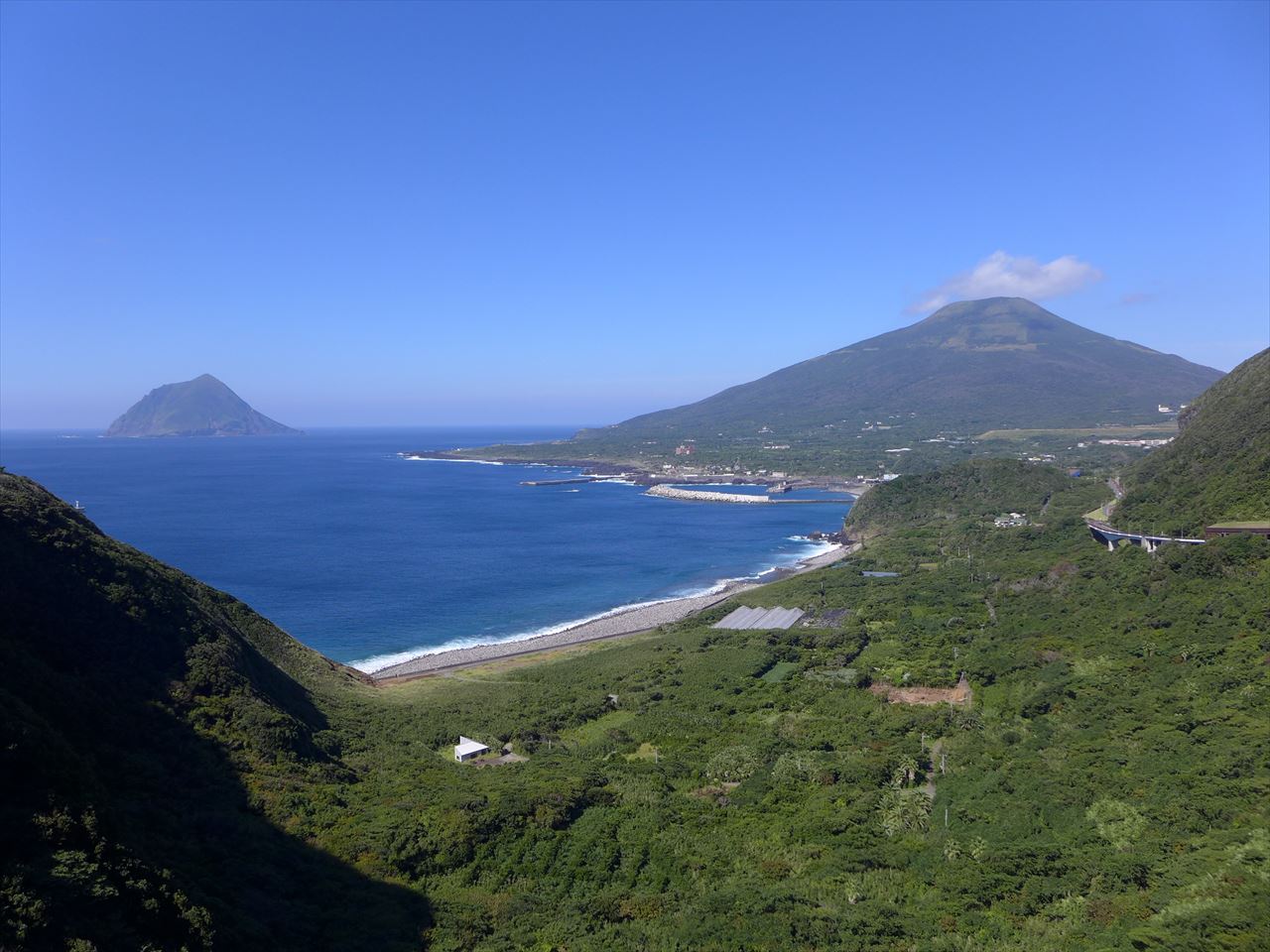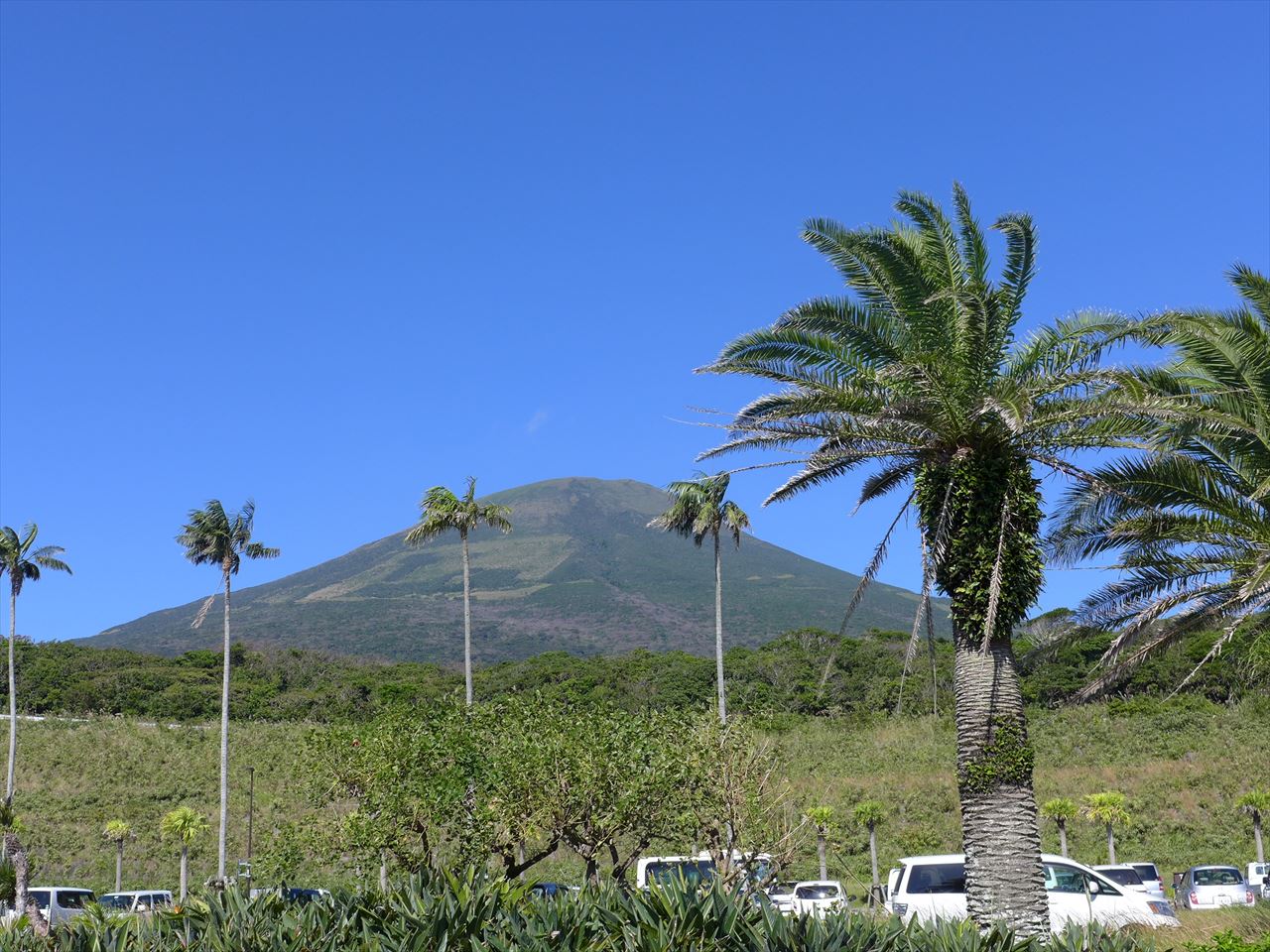 雲がかかってしまっていることも多い八丈富士だが、この日は頂上までくっきりと! これ以上ないくらい見事な秋晴れの日だ。山の中腹に四角く木を伐採した場所があるが、そこには牧場がある。以前車で行った時には牛がたくさん放牧されていた。