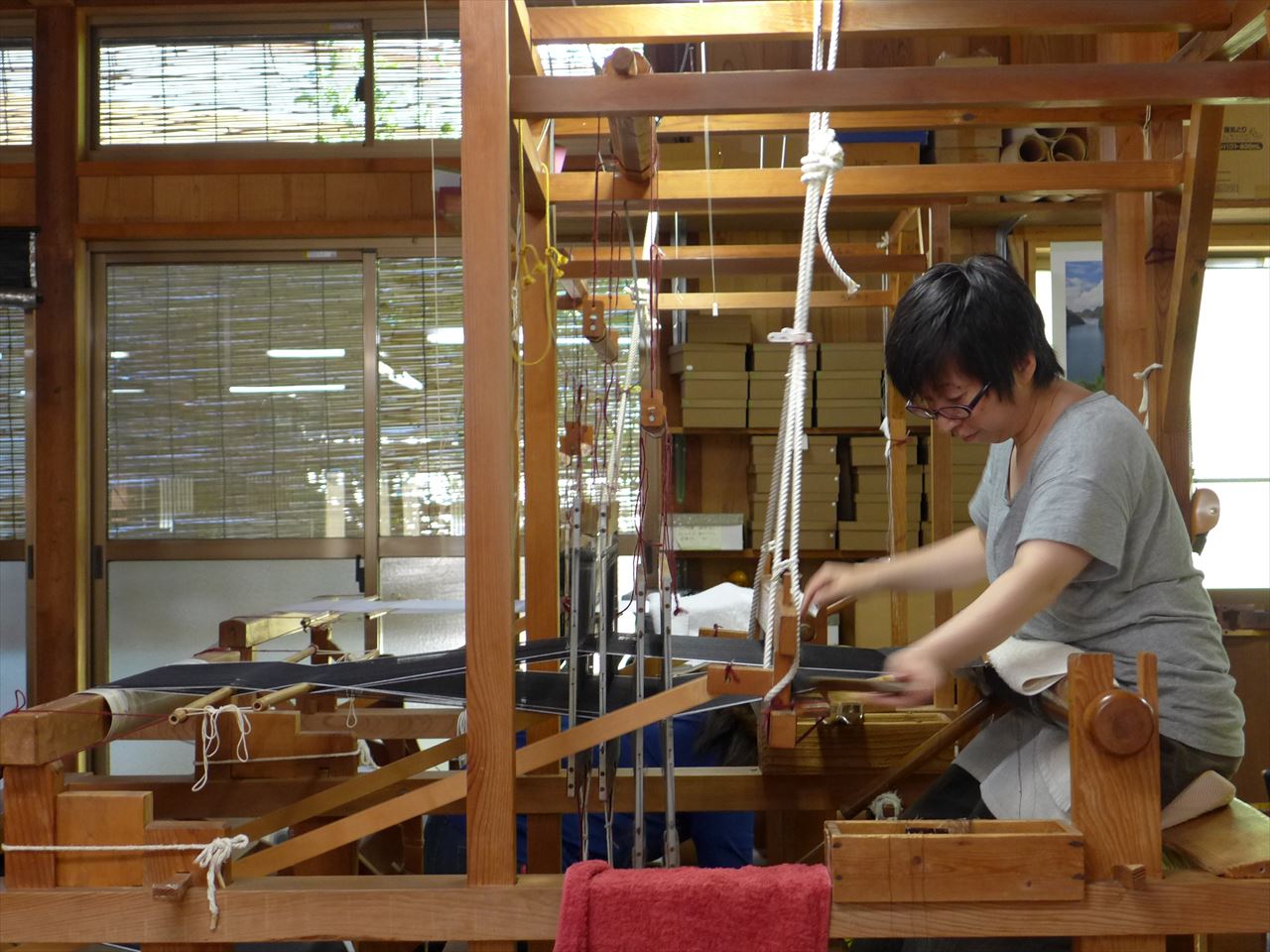 細い縦糸をものすごい数並べて織っている作業を間近で見ることができる。