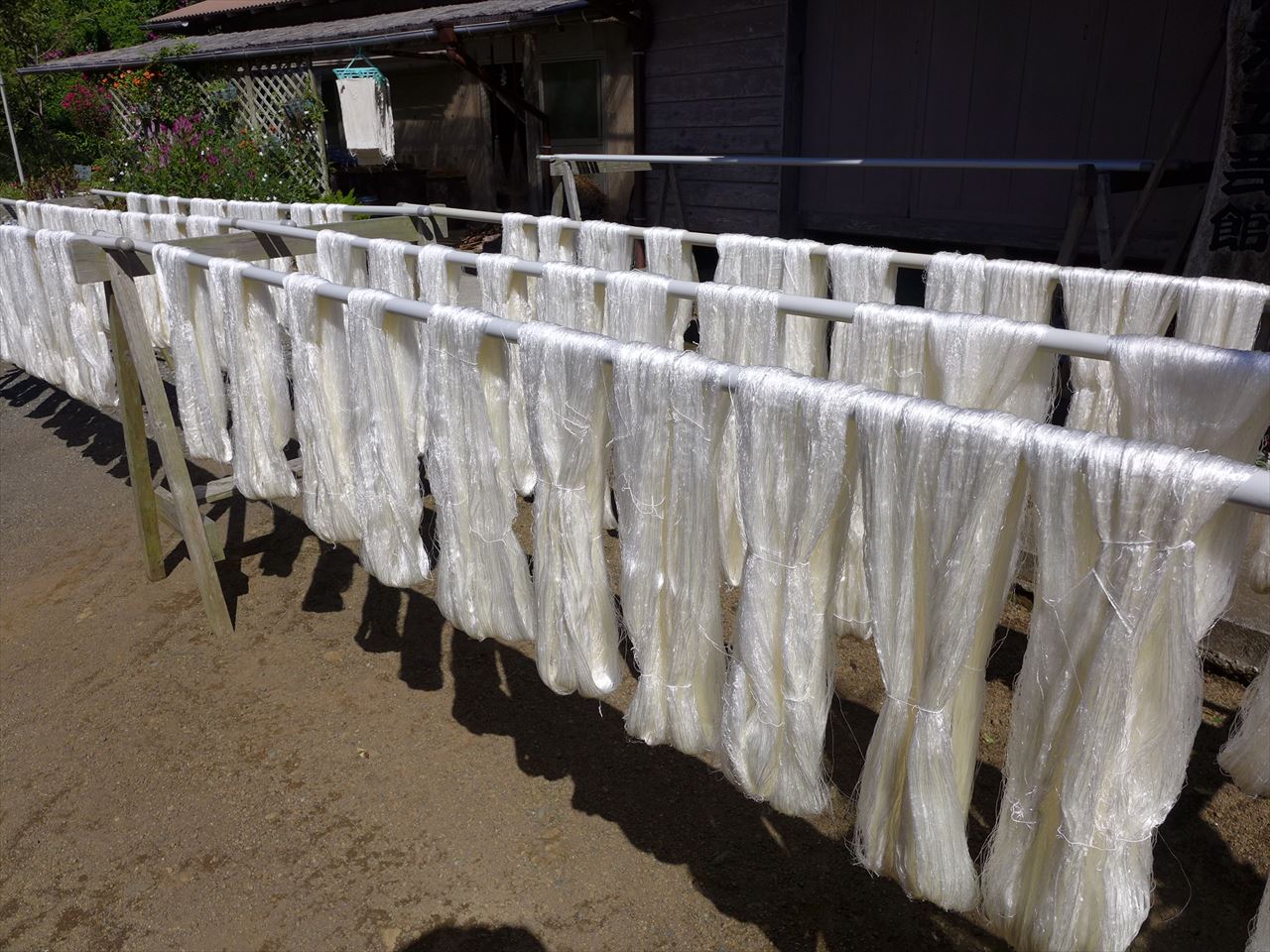 庭に干してあった白い絹糸もキラキラ輝いていて美しかった。これを染めるための染料と材料も展示されている。