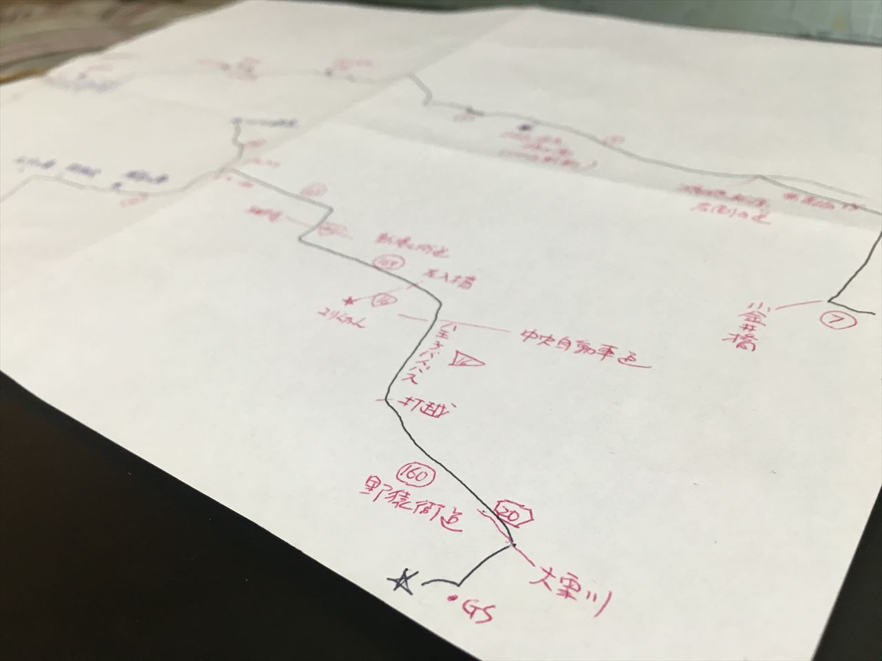 普段「海沿いツーリング」など、道迷いようがないツーリングばかりしている上、借りたバイクでナビもつけられず迷走しそうなので、手書きで地図を書いた。