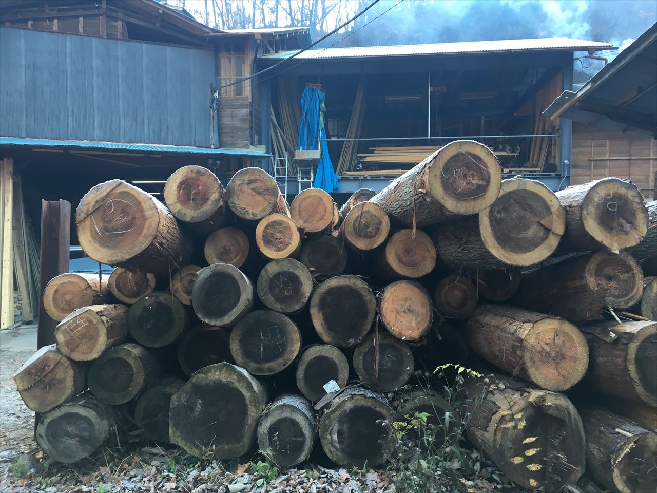 檜原街道沿いにも、丸太を積み上げている風景を見かけた。ところどころで煙があがっているのはは炭焼き?材木の乾燥?