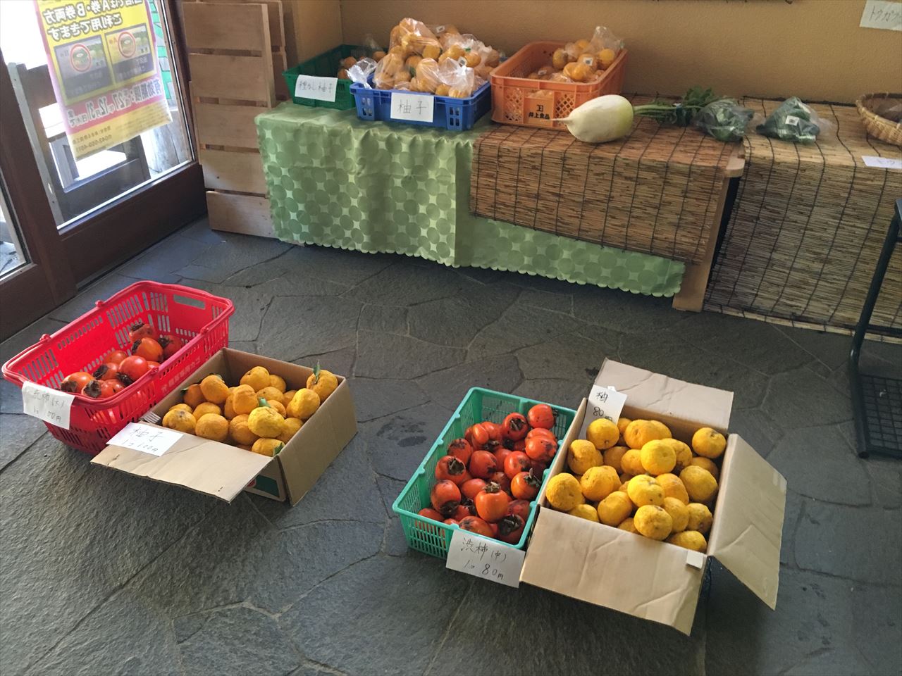 大きな柚子が段ボールとかごにぎっしり。これで柚子酒とか作ってもよさそう。
