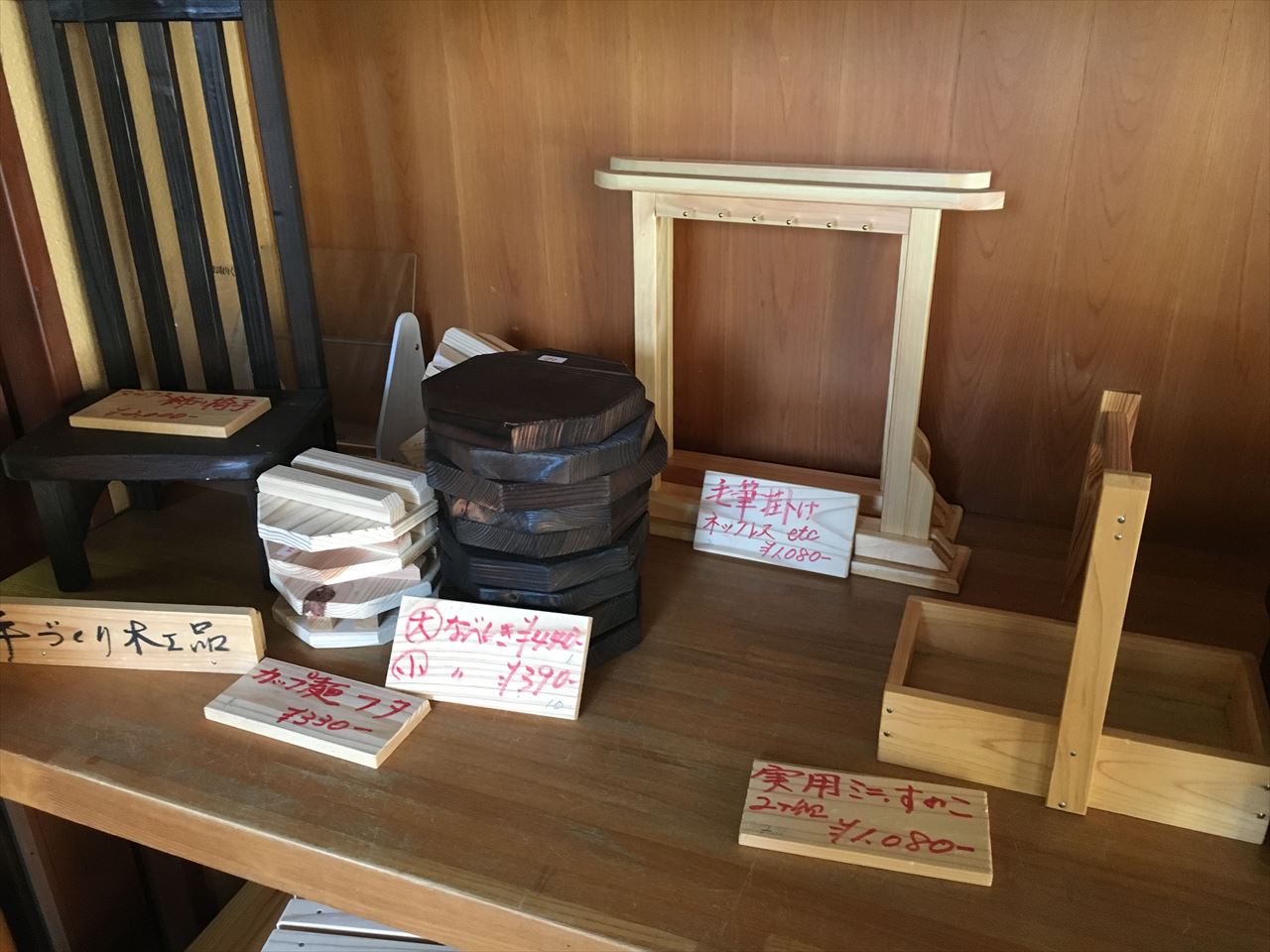 反対側には手作り木工品。