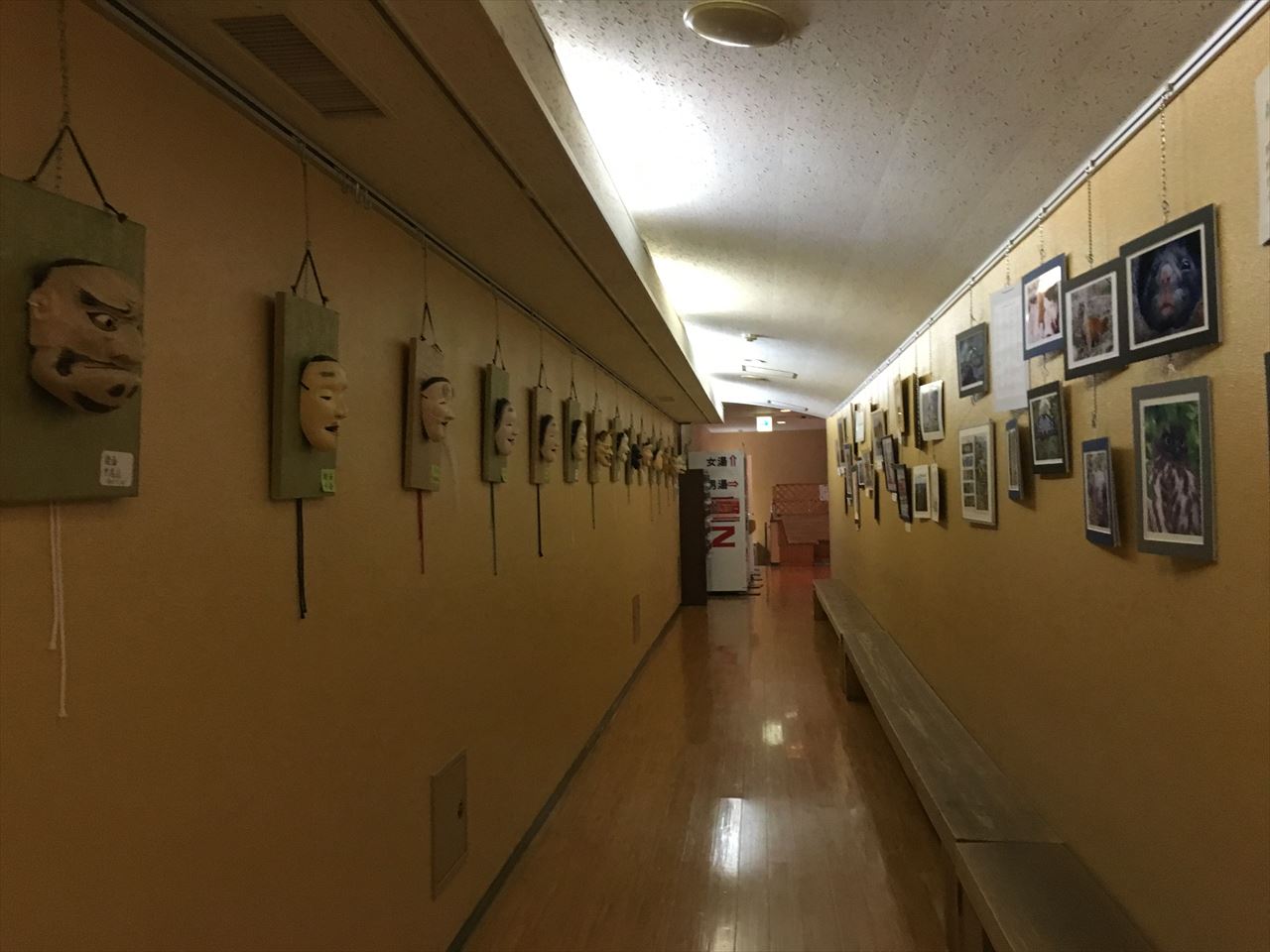 細い通路の両側には、お面と写真フレームがずらり掛けられている。