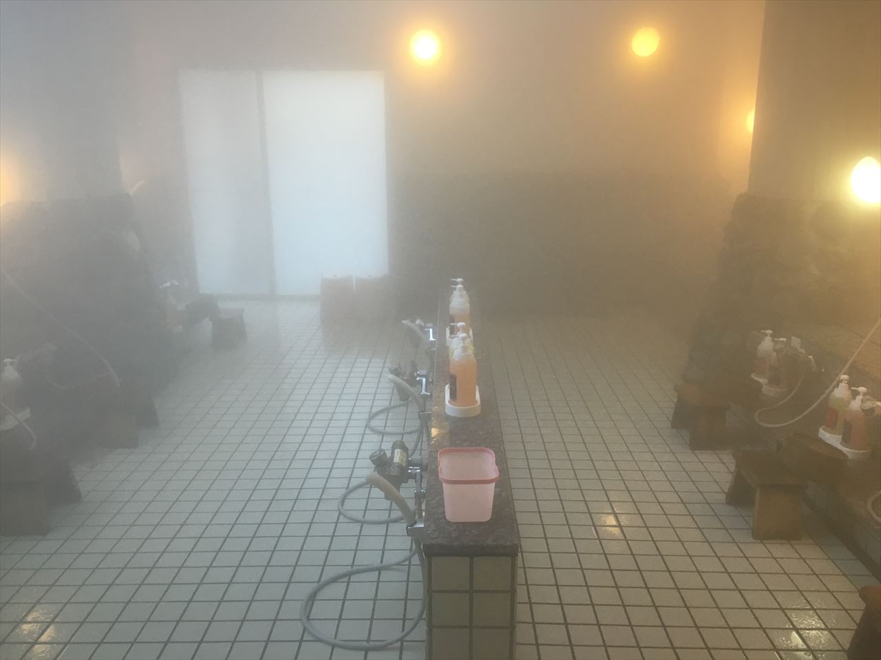 もしかしたら、冷え切った浴室を温めるため、事前にスタッフが洗い場中にお湯をシャワーでまいたのかもしれない。3メートル先がかすむほど湯気が立ち込めていた。