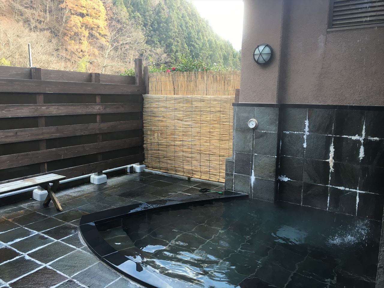 街道に面しているため、板塀で目隠しされているのだが、石造りの湯船に肩まで浸かってごろんと壁にもたれかかると、板塀の向こうの山がすぐ近くに見える。