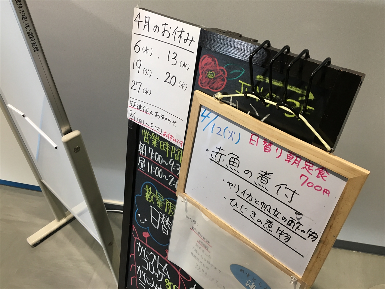 「レストラン海(かい)」という名前で、朝は7時から9時半まで(日曜以外)、昼は11時から14時半まで営業している。毎週水曜日が定休日だ。