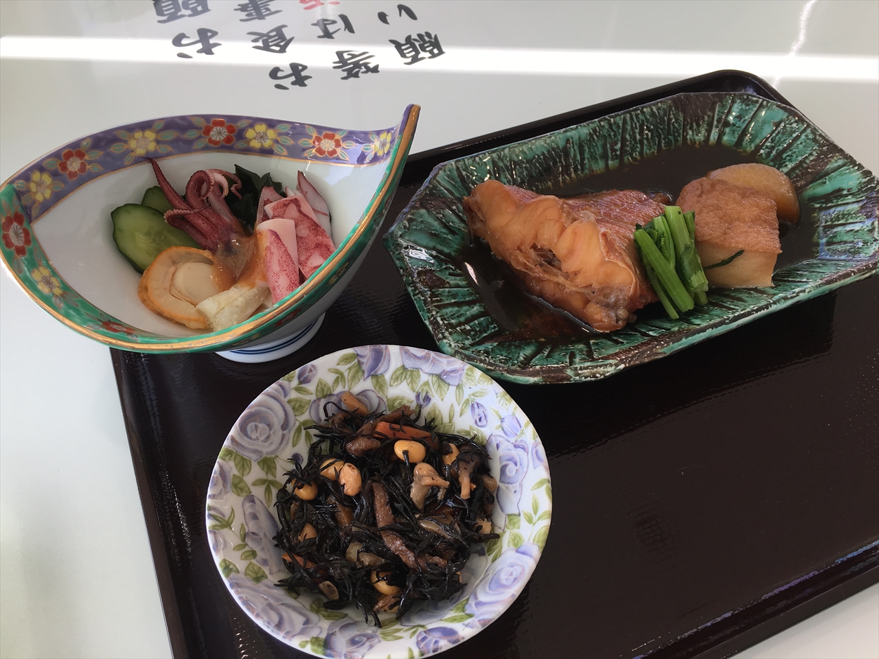 赤魚はかなり肉厚でふっくら。ヤリイカとホタテの酢のものも美味しそう。