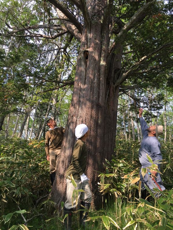 成人男性3人で手をつなぎやっと幹を囲める太さのオンコの木は雄々しい。