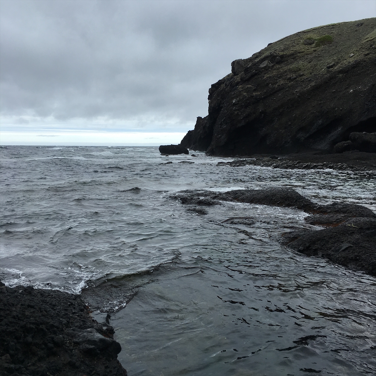 海岸の岩場は黒々とした色で、垂直に切り立ったものが多い。